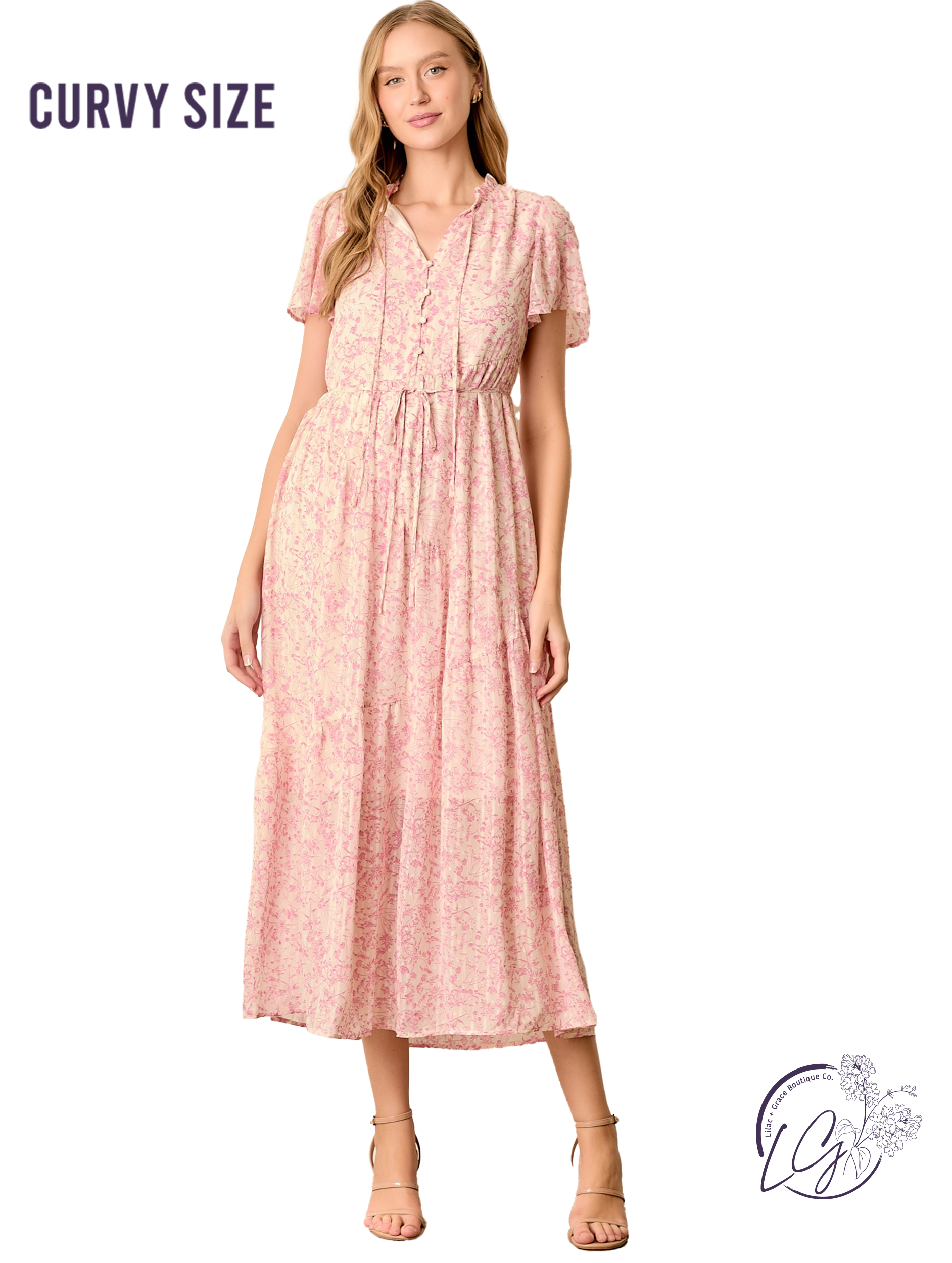 Light and flowing, this ditsy print maxi dress features a flattering V-neckline and short sleeves for a balanced, breezy silhouette. The asymmetric tiered skirt adds movement and dimension, while the soft floral pattern brings a delicate, playful touch. Perfect for warm days or weekend outings, just pair it with sandals and a crossbody for an easy, polished look.