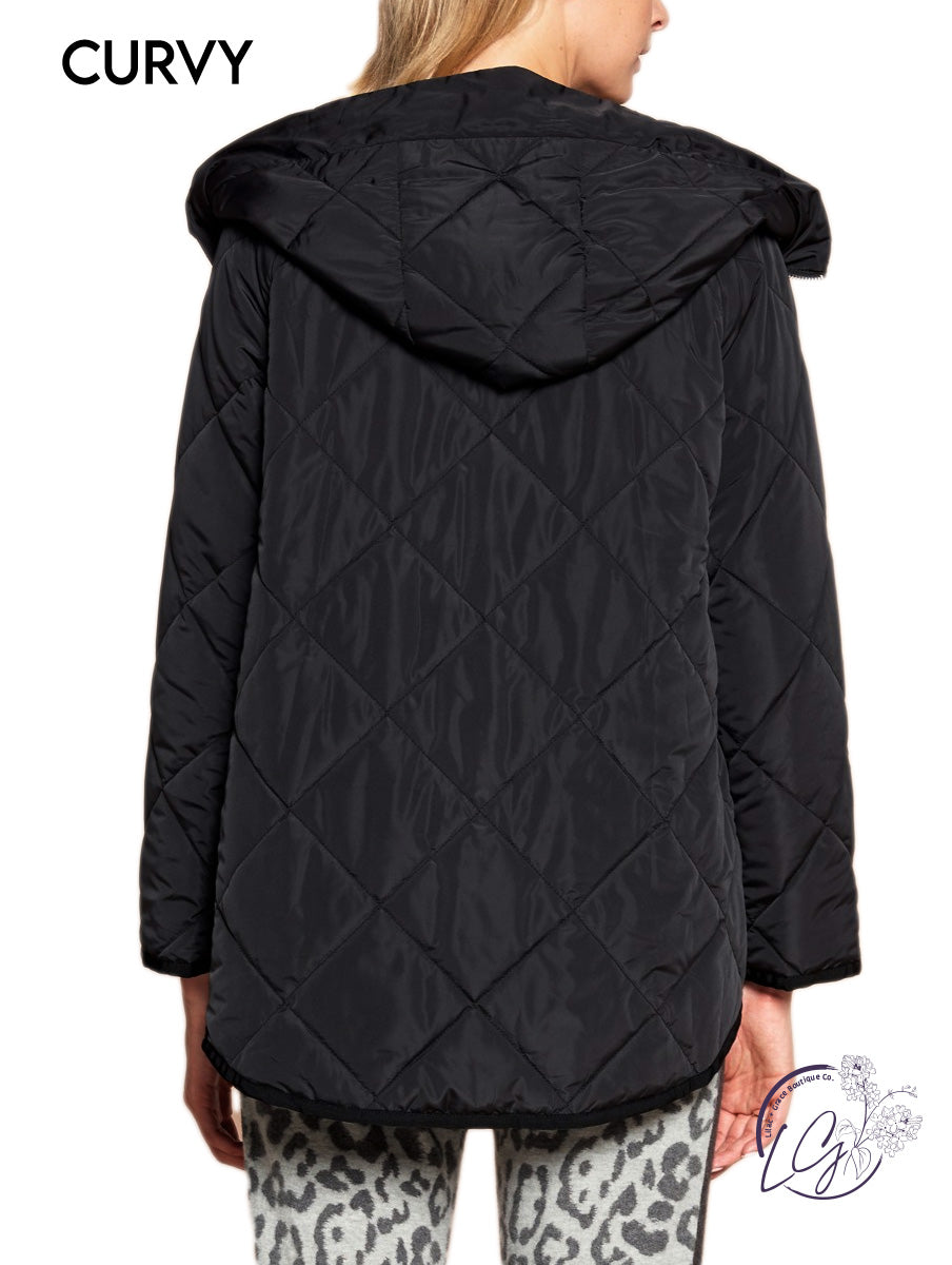 Solid quilted zip-down jacket featuring long sleeves and a hoodie with drawstrings.
