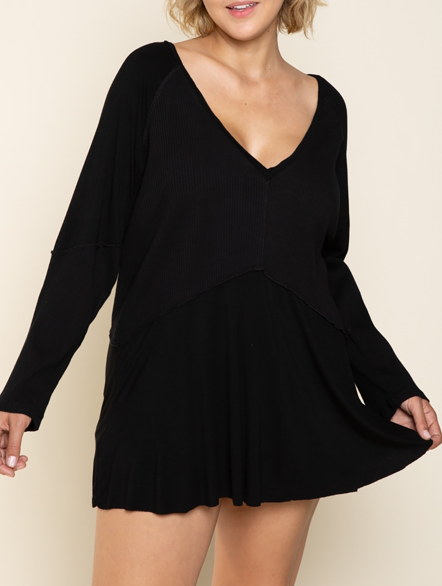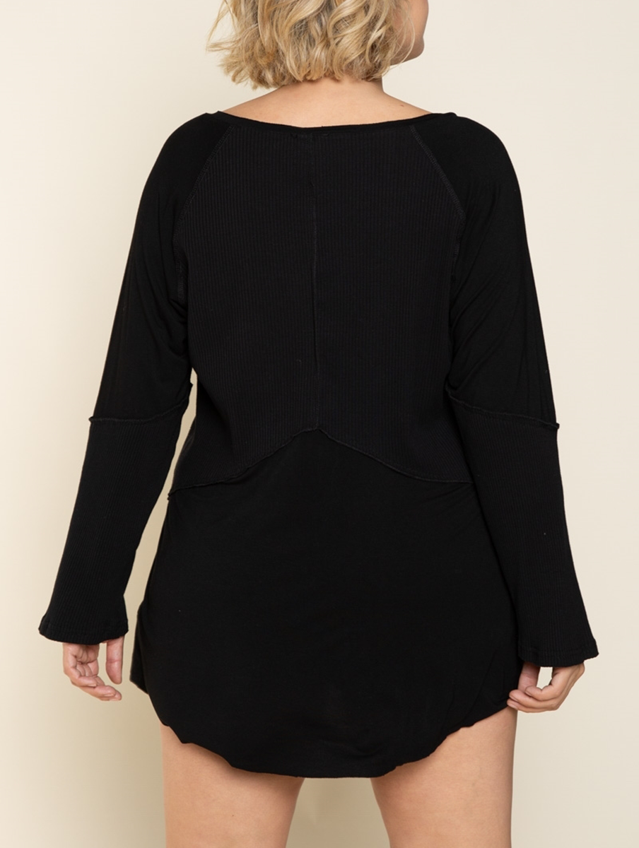 Curvy Light Wash Long Sleeve Top with Rib Textured Sleeve and Torso Detail.