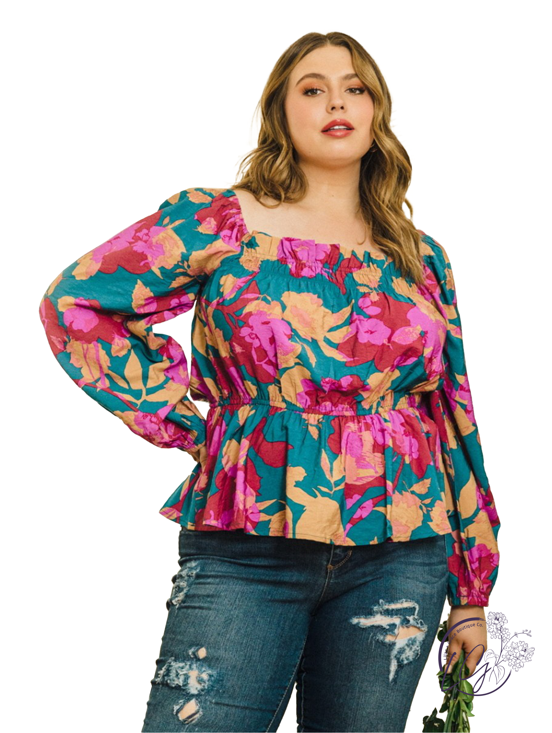 Get ready to turn heads with our Curvy Rustic Bloom Peplum Top! This trendy square ruched neck top features a flattering peplum style, complete with puff long sleeves and an elastic waistband. Elevate your wardrobe with this statement piece that will have you feeling confident and stylish all day long!