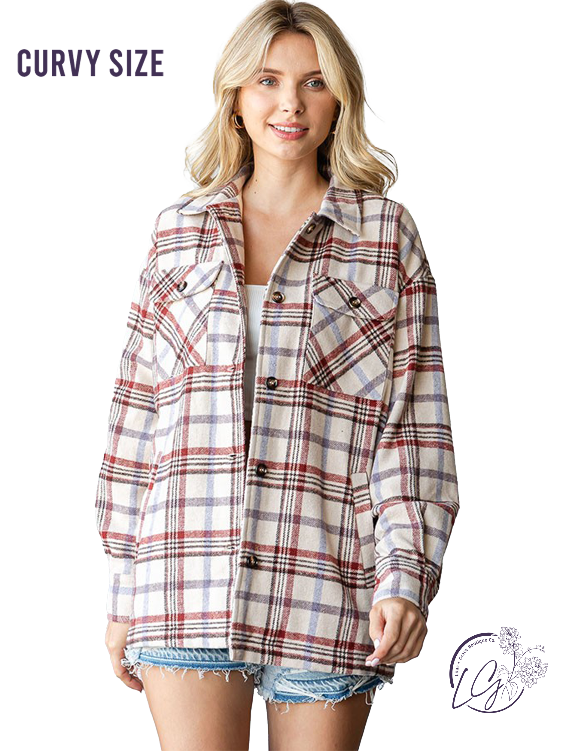 This relaxed-fit plaid shacket blends classic style with everyday comfort. Designed with a collared neckline, it features a button-front closure, cuffed long sleeves, and both chest and side pockets for functional layering. The soft fabric and loose silhouette make it an ideal throw-on piece for cool, casual days. Style it over basics or knits for an easy, laid-back look.