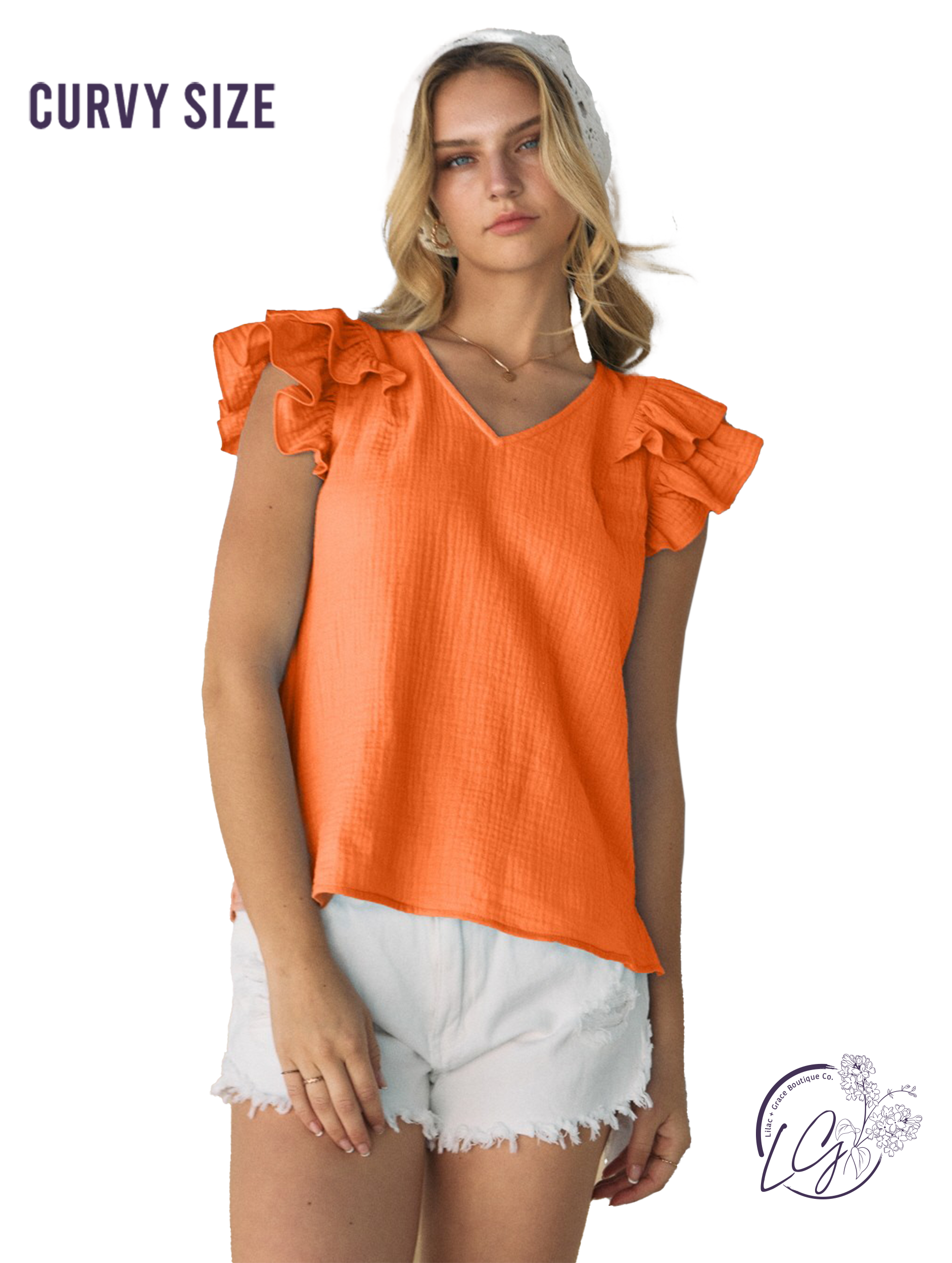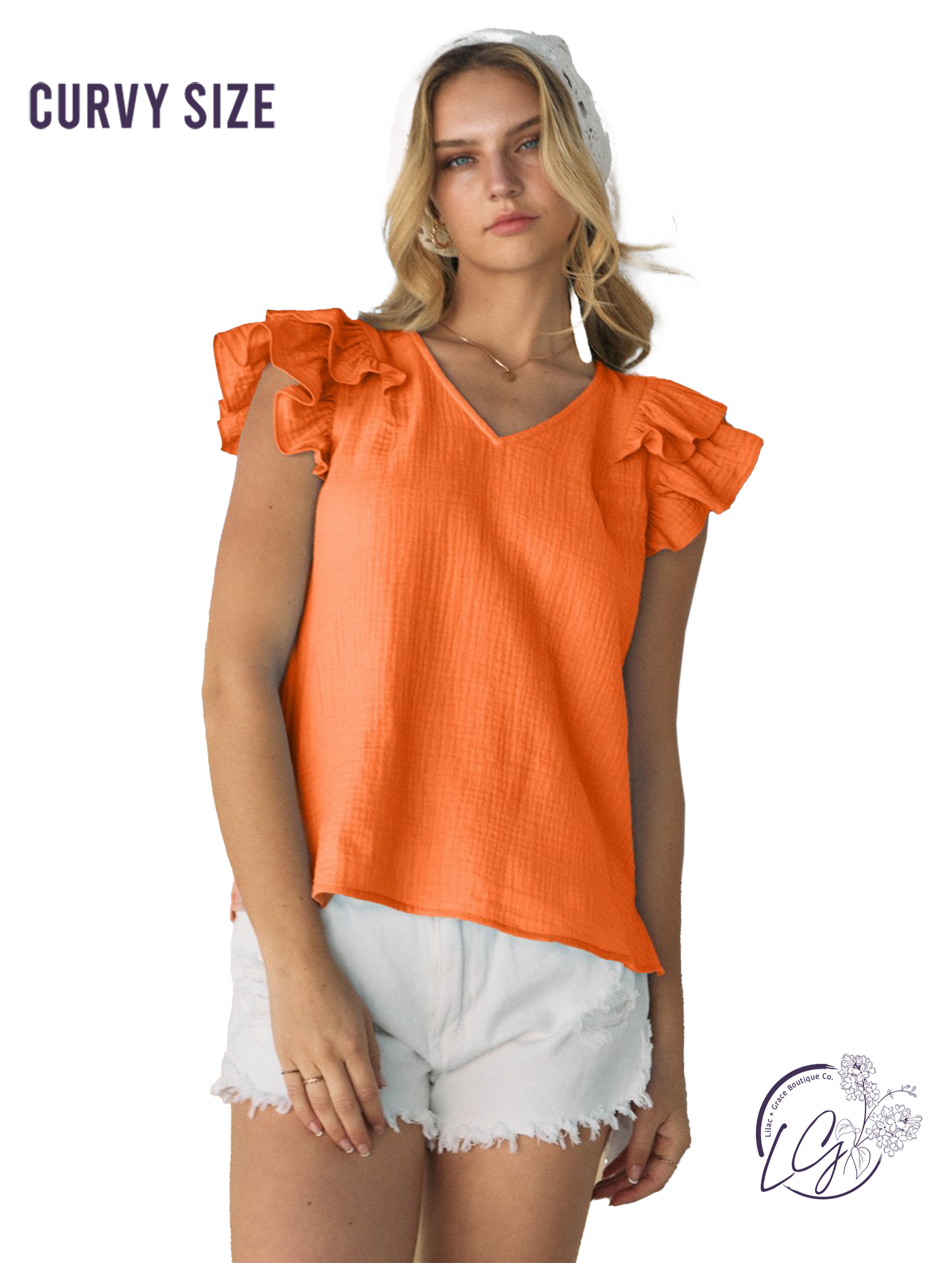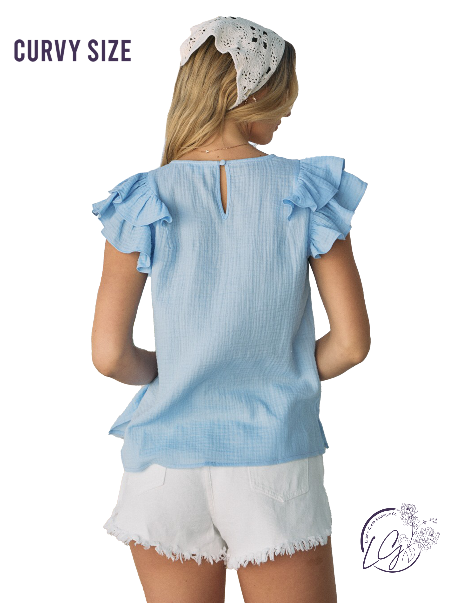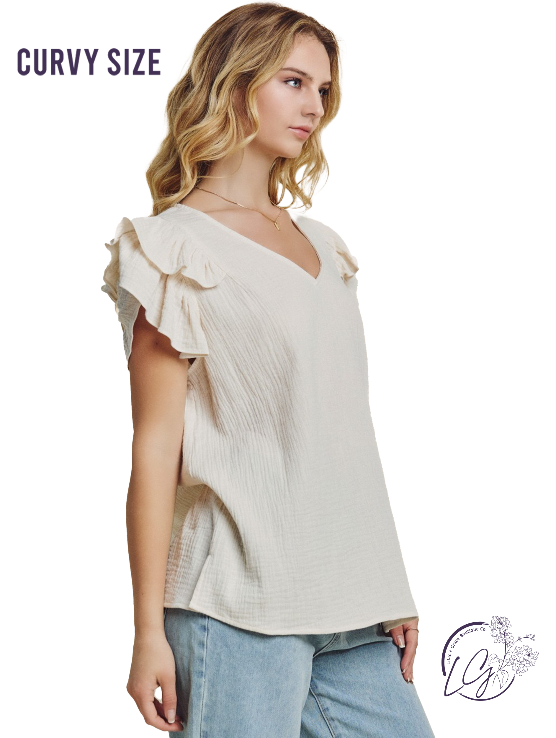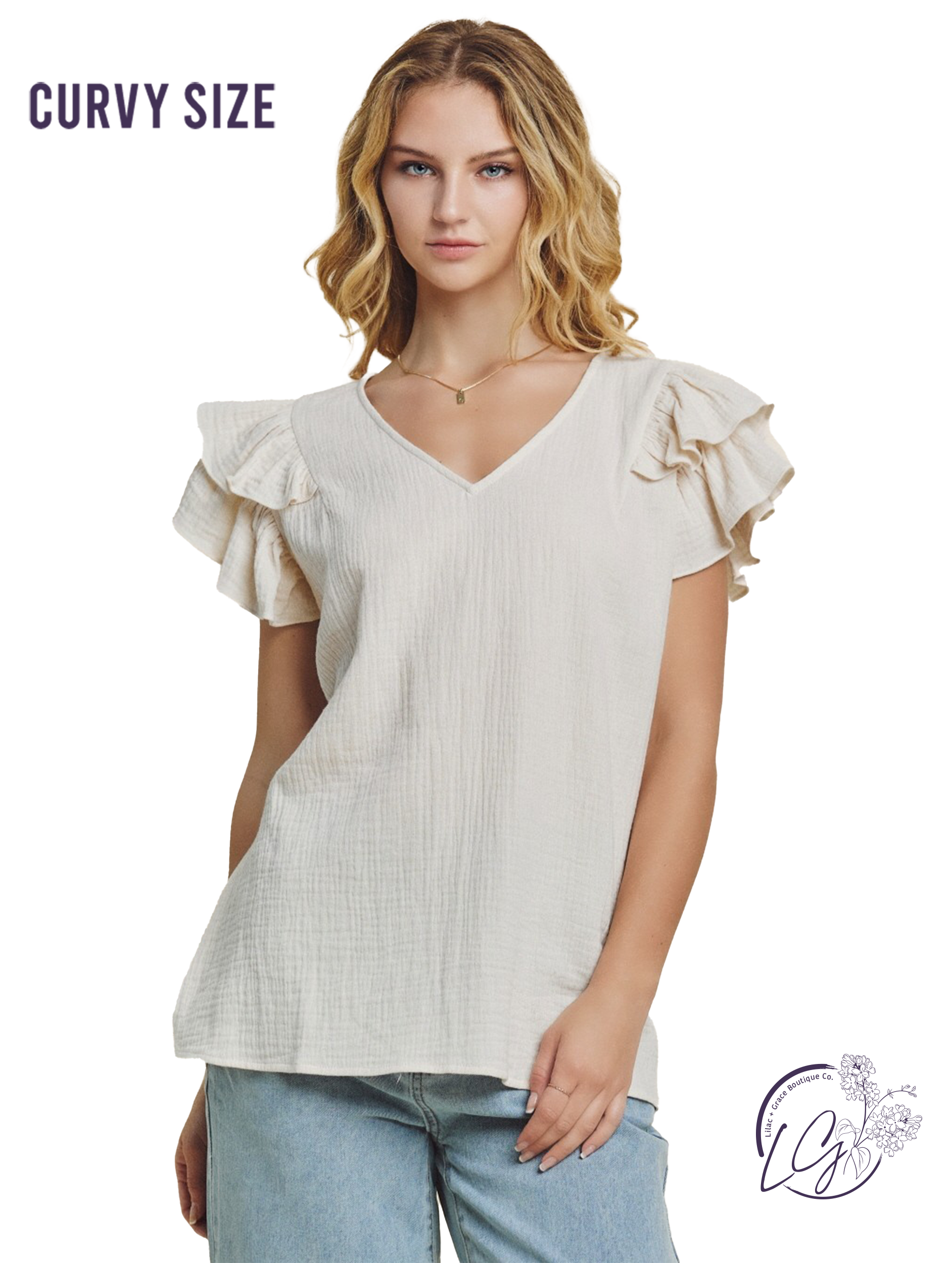 Elevate your look with our Curvy Sunday Brunch Ruffle Sleeve Blouse! Made from solid cotton, this stylish blouse features a flattering v-neck and back button closure. The short ruffle sleeves add a touch of feminine charm to any outfit. Get ready to turn heads and make a statement with this must-have piece!