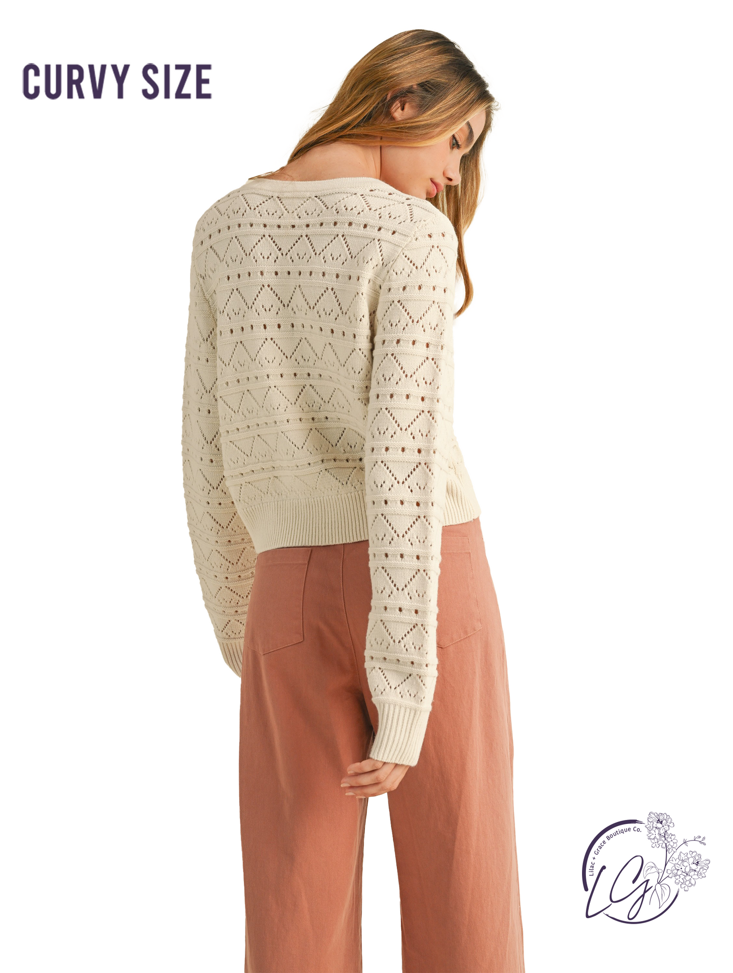 This cropped crochet cardigan features an intricate openwork knit and delicate floral button closures for a soft, feminine finish. The fitted silhouette is framed with long sleeves and ribbed trim at the cuffs and hem, adding structure to the airy design. Made from high-quality knit fabric, it layers beautifully over dresses, tanks, or tees—perfect for adding texture and charm to your everyday look.