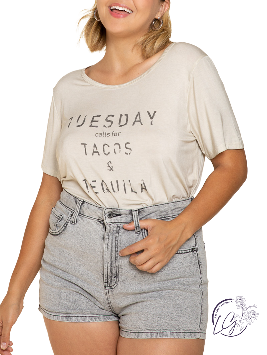 Curvy You can't go wrong with TACO TUESDAYS! This knit print top will be your favorite slogan piece to wear every Tuesday. Designed with a relaxed fit, round neckline, short sleeve with finished clean hem.