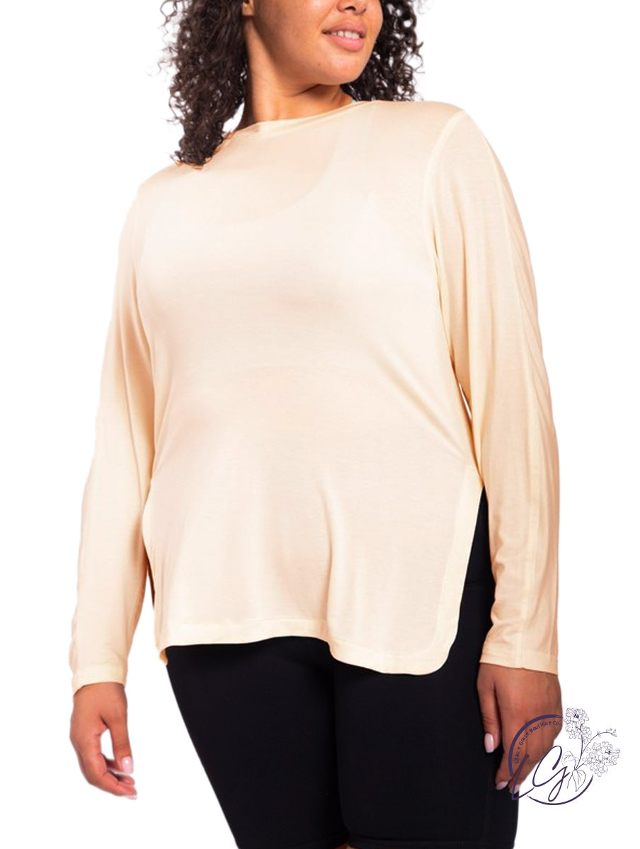 The perfect long sleeve to dress up or dress down. It has a round neckline, raglan-like sleeves, and a curved hemline with side slits up to the hips.