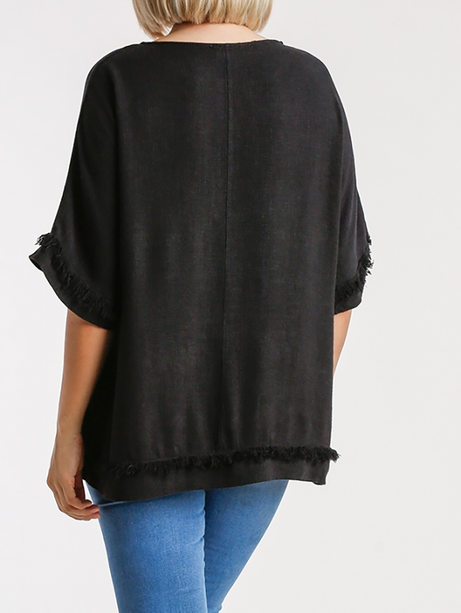 Curvy Linen Blend Round Neck Short Sleeve Top with Frayed Details