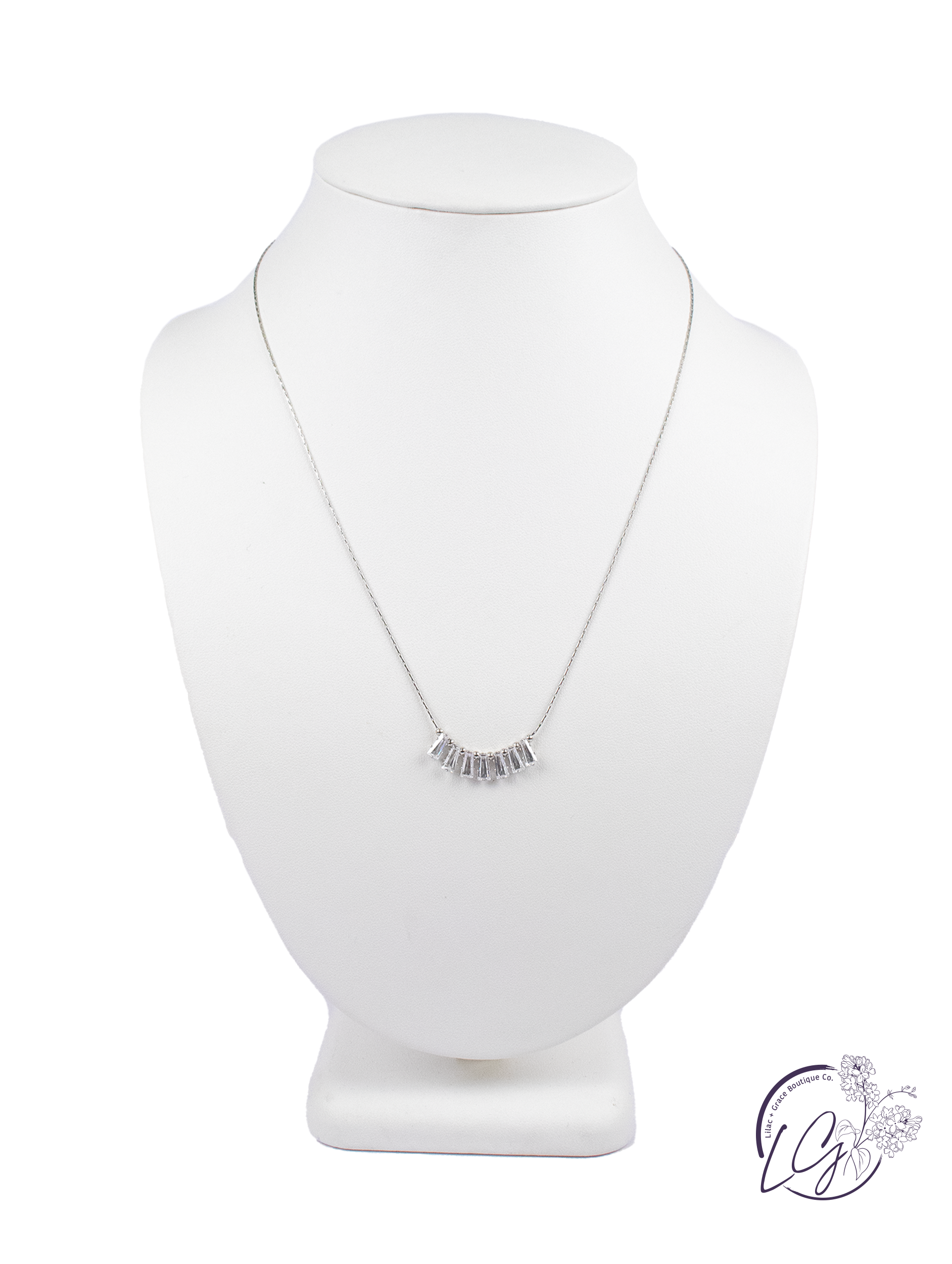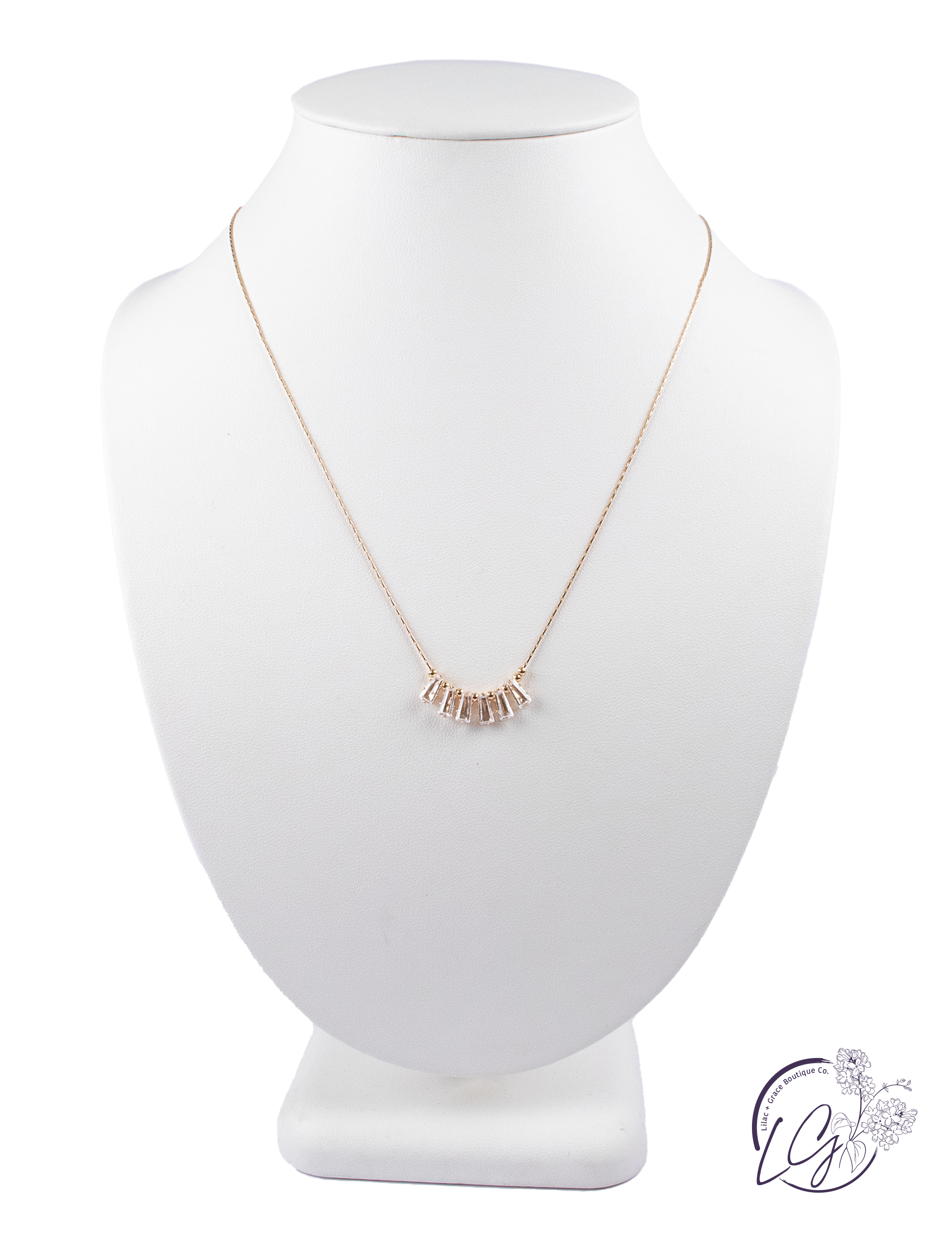 Elevate your everyday style with this elegantly understated necklace. Featuring a delicate chain, this piece showcases a gracefully curved bar adorned with a series of dazzling baguette-cut crystals. Each crystal is individually wrapped, creating a subtle sparkle that catches the light beautifully. Perfect for layering or wearing on its own, this necklace adds a touch of modern sophistication and radiant charm to any outfit.