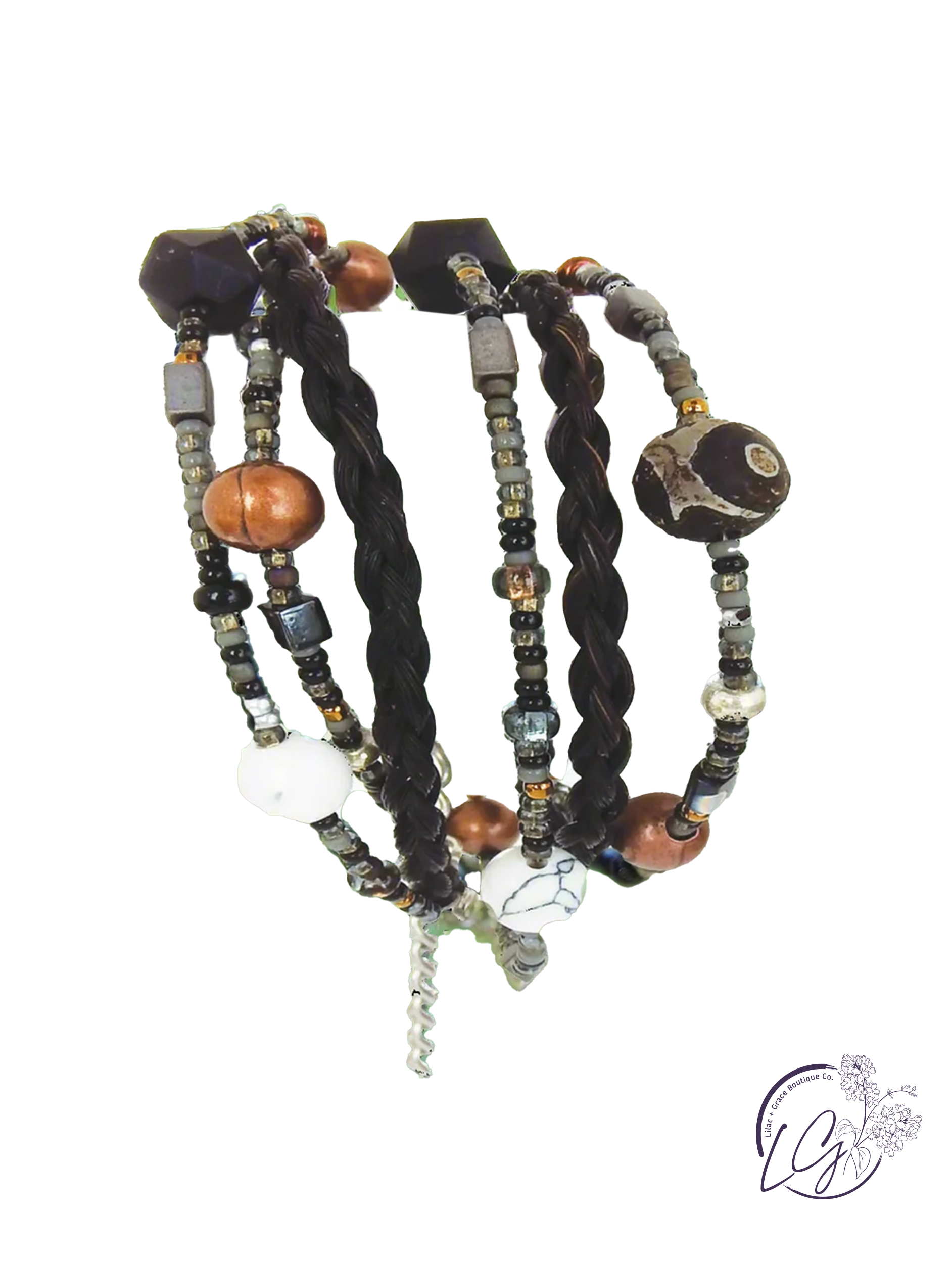 A dramatic flair can be yours with the Dakota beaded wrap bracelet. Metallic beads in tones of silver and copper are complimented with neutral seed beads and a black strand of braided Authentic Horse Hair. The lobster claw closure plus 3" chain allows this bracelet to adjust for a perfect fit.