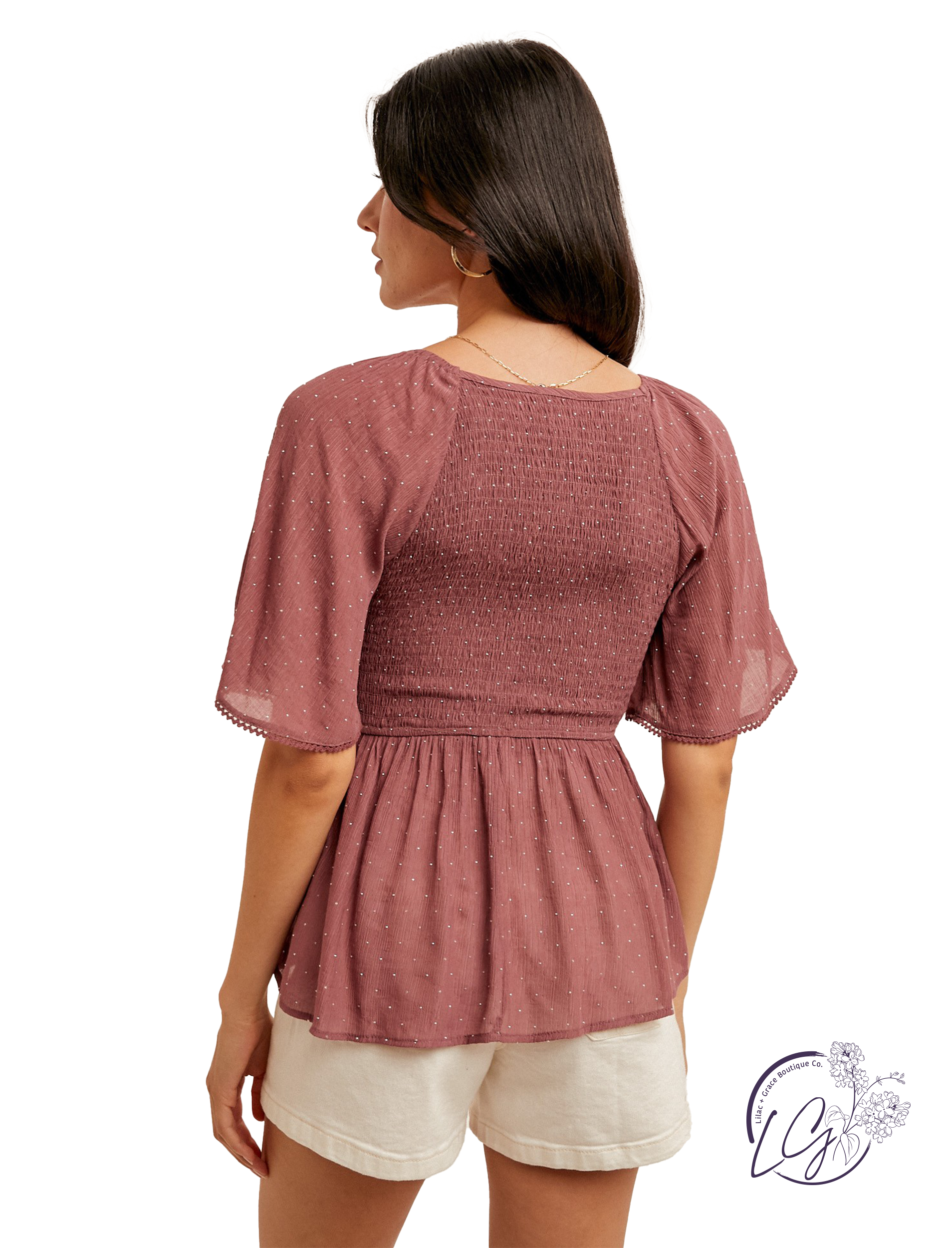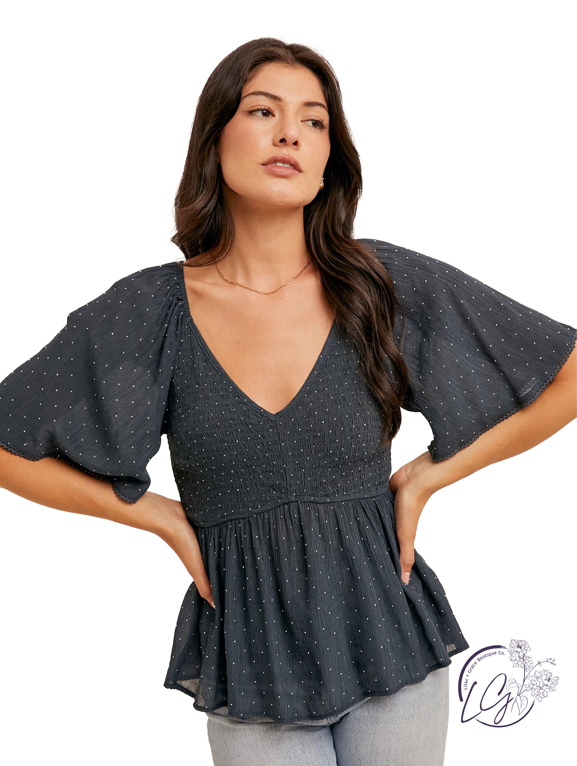 Step onto the dance floor and shine like a star in our Dance Like Stars Top! This gorgeous top features flutter sleeves adorned with rhinestuds, adding a touch of sparkle to your movements. The smocked peplum design adds a flirty flair, making you feel confident and stylish as you move.