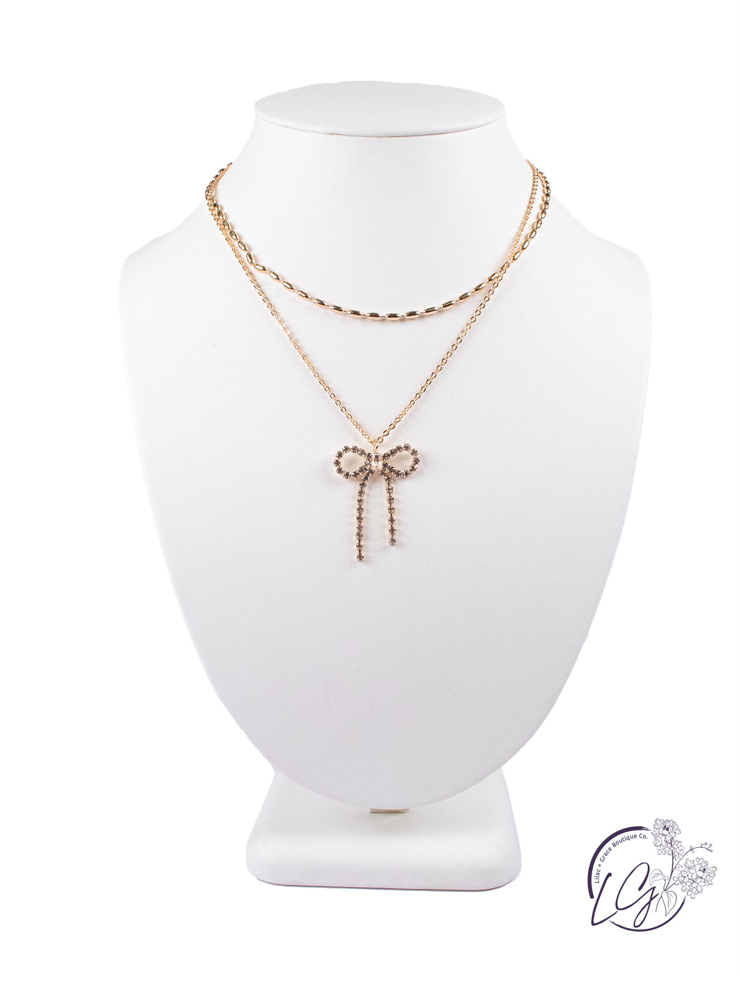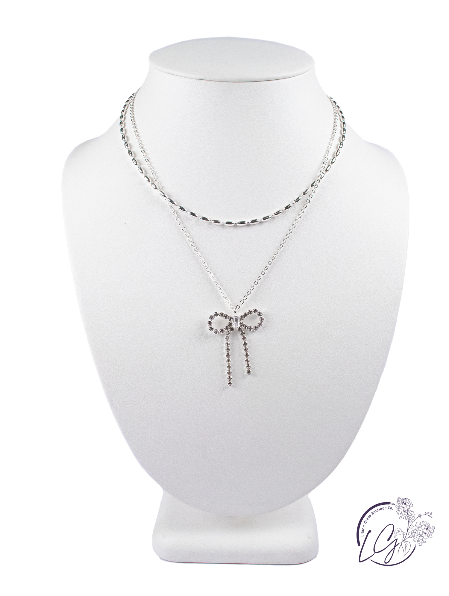 Add a touch of sparkle and feminine charm to your ensemble with this exquisite layered necklace. The centerpiece features a beautifully crafted bow pendant, completely encrusted with shimmering rhinestones that catch the light with every movement. This elegant bow hangs from a delicate chain, complemented by a second, slightly shorter chain with a unique bar-link design, creating a stylish layered look. Perfect for adding a hint of glamour to any outfit, this necklace is sure to become a cherished addition to your jewelry collection.