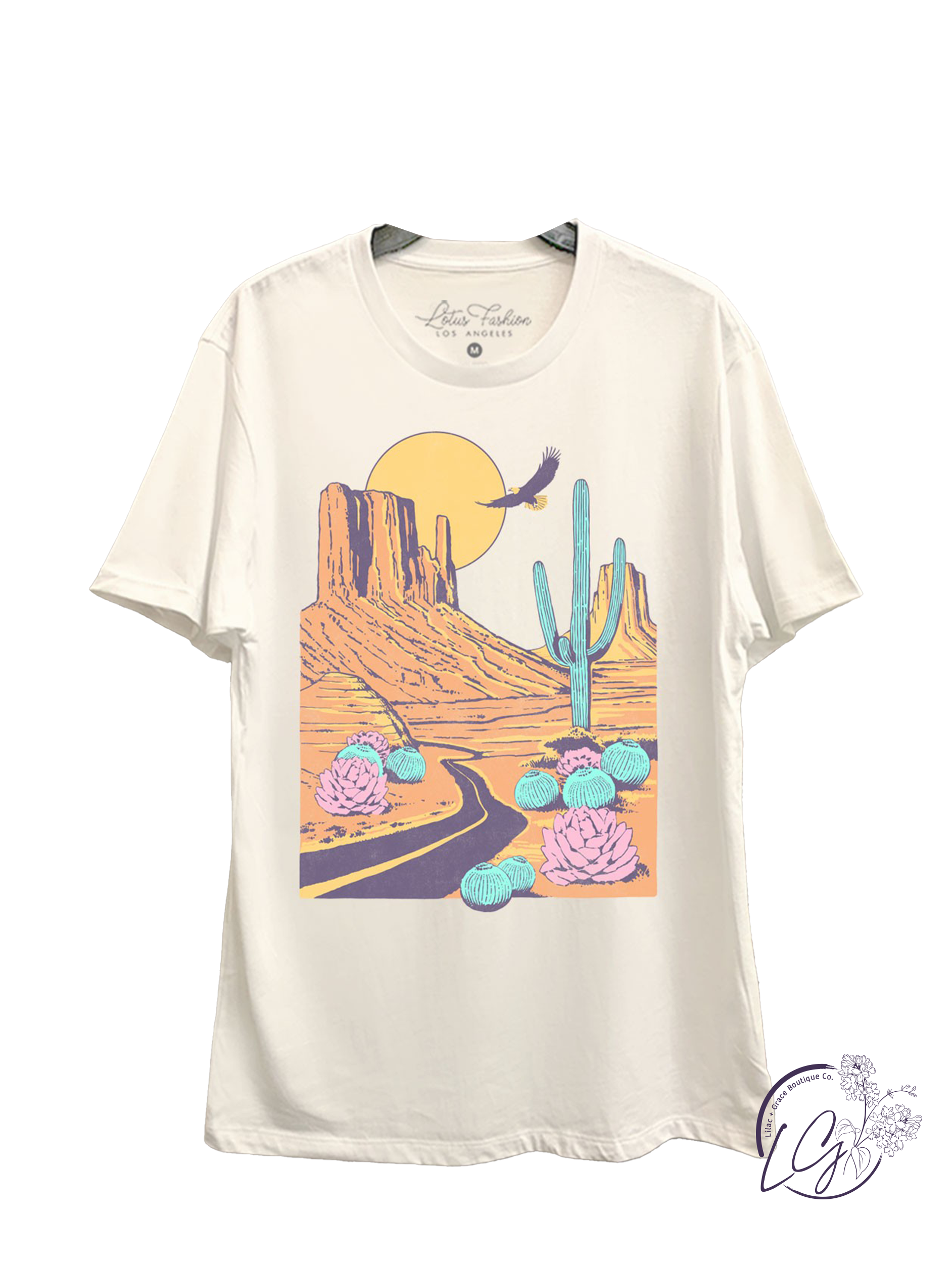 Experience comfort and style with our Desert Road Graphic Top! This Lotus Boyfriend Tee is crafted from soft 100% cotton and features a loose fit, open neckline, and dropped sleeves. Embrace a relaxed look with this non-washed, short sleeve crew neck graphic tee. Enjoy the benefits of both comfort and fashion with this must-have piece.