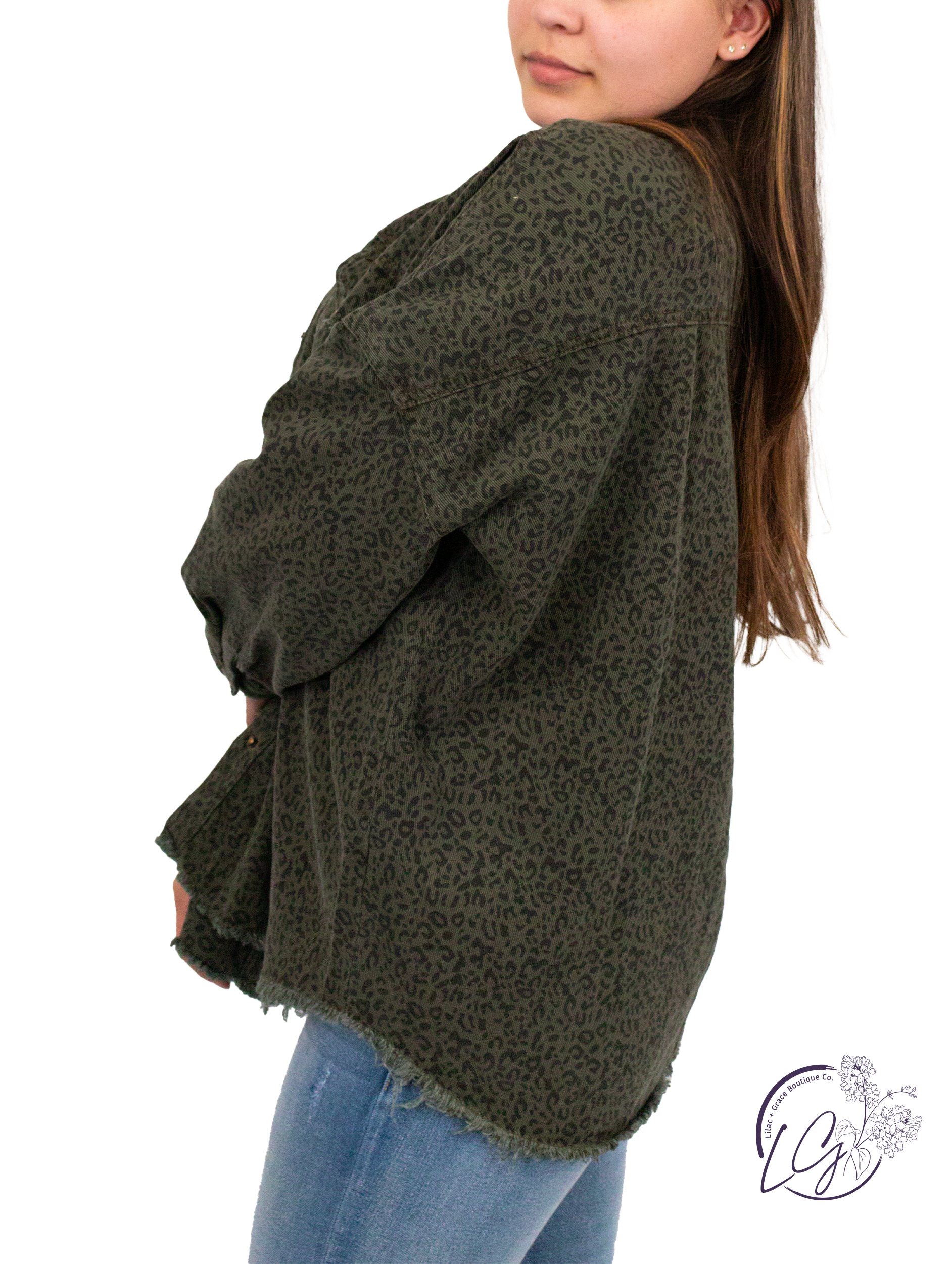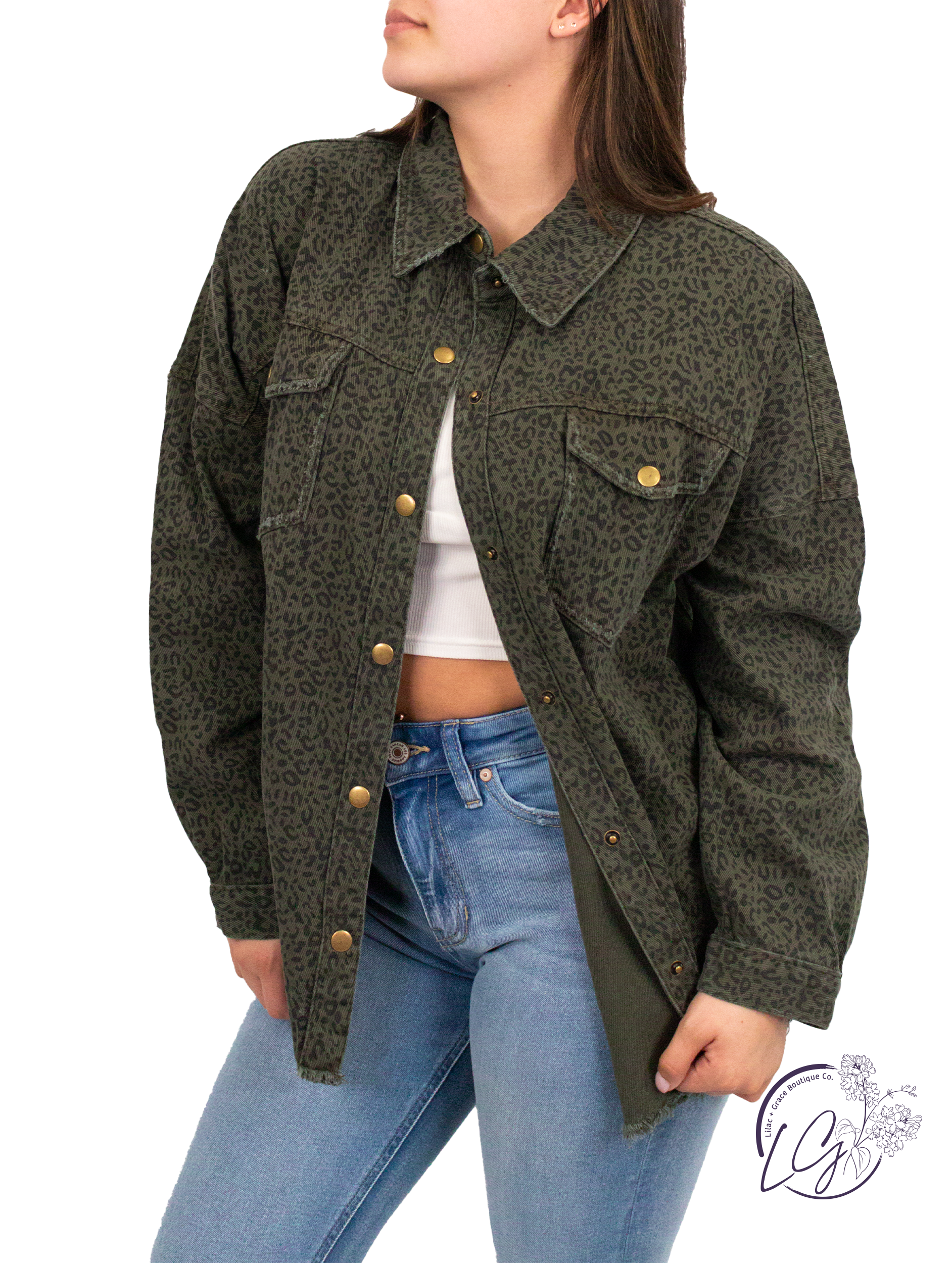 The "Leopard Distressed" Military Jacket is a fashion-forward blend of rugged and edgy style. This jacket features a distinctive leopard print pattern combined with a distressed military-inspired design, creating a unique and bold statement piece. With its structured silhouette and distressed details, it exudes a rebellious and trendy vibe. Perfect for those who want to make a bold fashion statement, this jacket adds an element of wild style to your wardrobe, making it an eye-catching choice for various occasions.