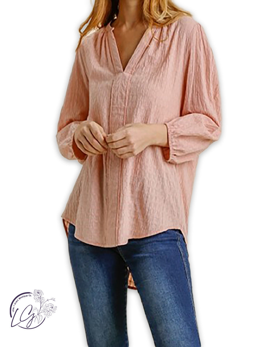 Textured Split Neck 3/4 Sleeve Panel Top with High Low Scoop Hem