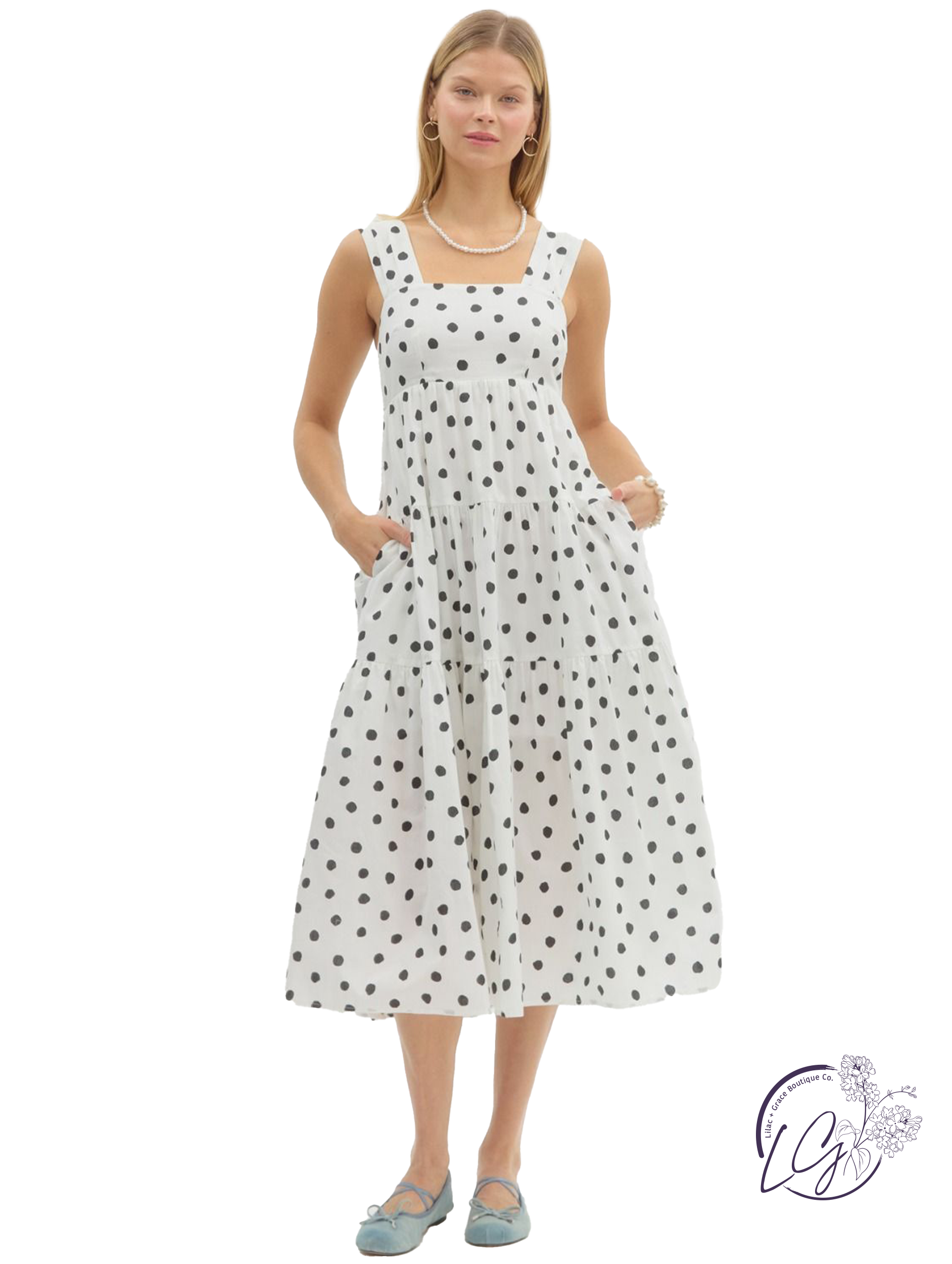This polka dot print midi dress features a high empire waist and a tiered skirt that flows with soft movement. Pleated wide shoulder straps add structure and charm, while the lightweight fabric offers a breezy feel. Perfect for sunny days or casual outings—just pair with slides or espadrilles for an easy, playful look.