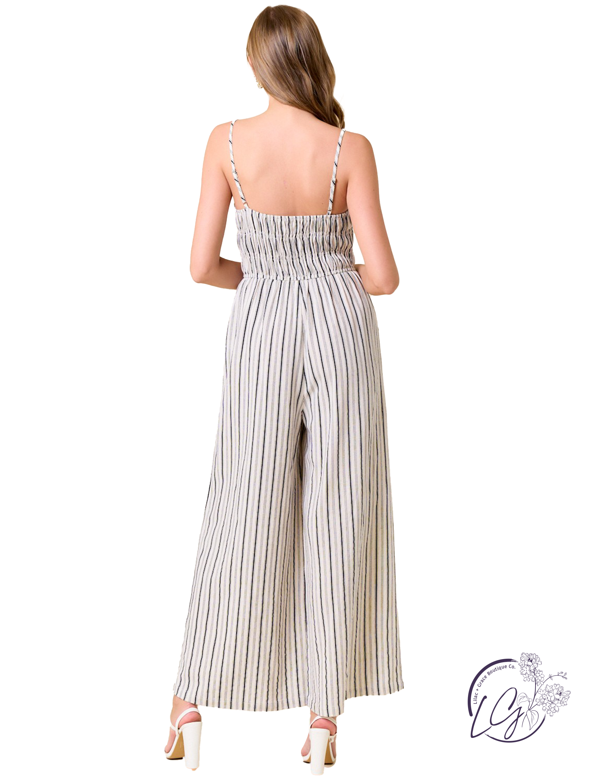 Move with ease in this linen-blend wide-leg jumpsuit, designed with timeless navy and white stripes for a sophisticated yet relaxed feel. The smocked bodice offers a flattering, flexible fit, while delicate faux button detailing adds a touch of detail. Adjustable straps ensure comfort, and side pockets bring functionality. Crafted from a breathable linen blend, this jumpsuit is perfect for sun-filled outings or dressed-up evenings. Pair it with strappy sandals for a laid-back vibe or elevate the look with heels and a woven clutch.