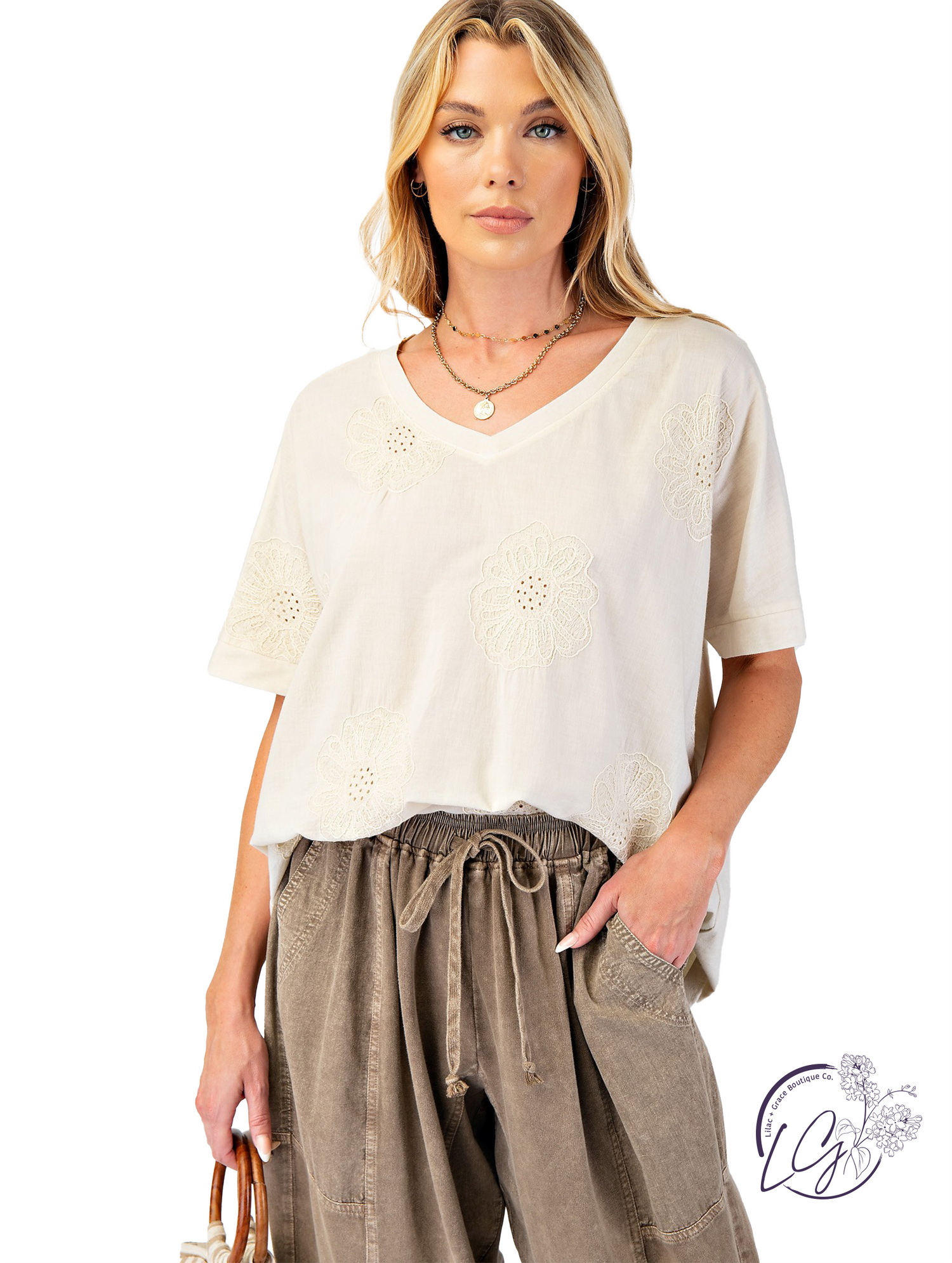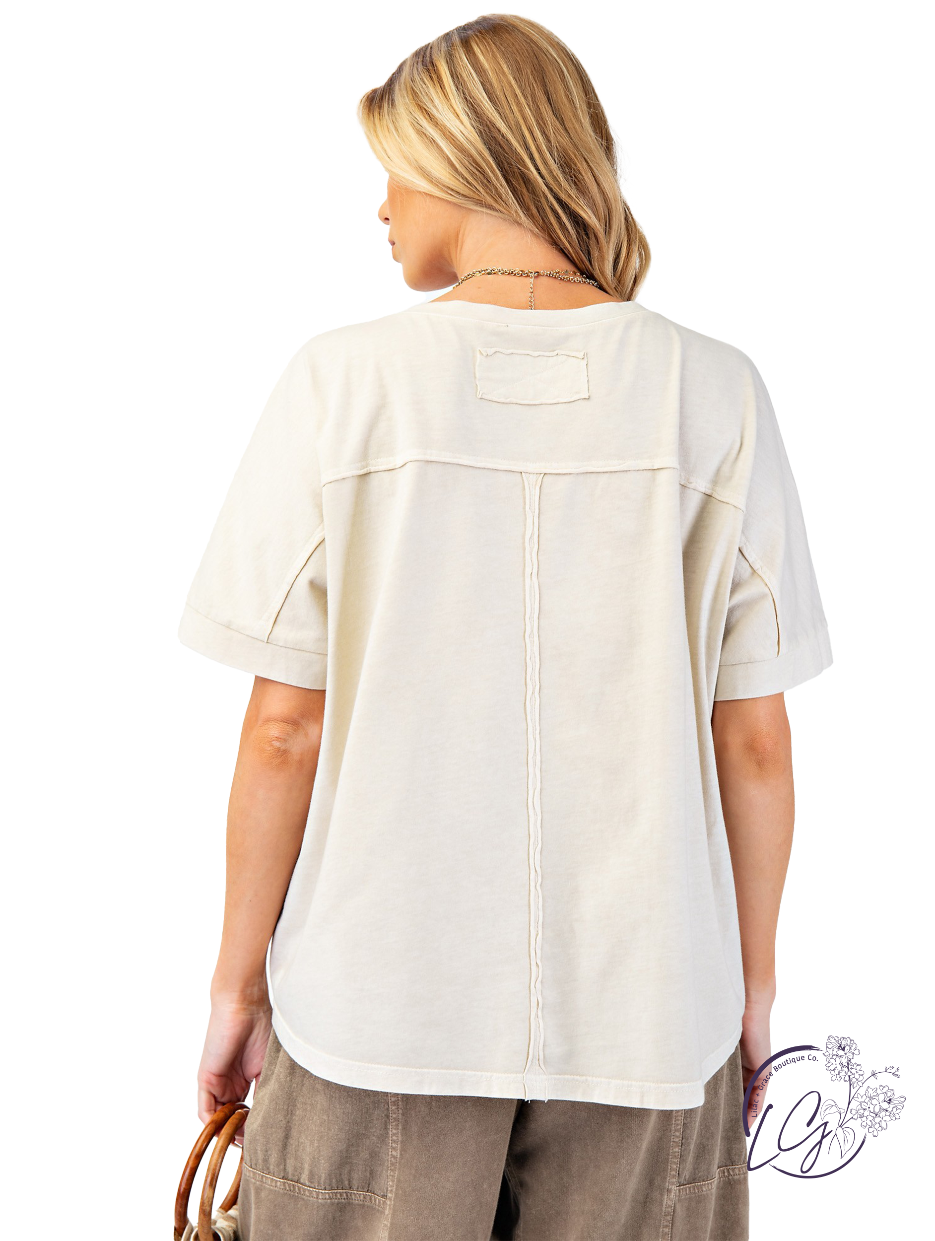 This mineral washed boxy top features a deep v-neckline and a textured, embroidered front for a touch of artisanal detail. Raw cut and defined seam detailing across the back adds character, while the relaxed, loose fit makes it an easy staple for everyday wear.