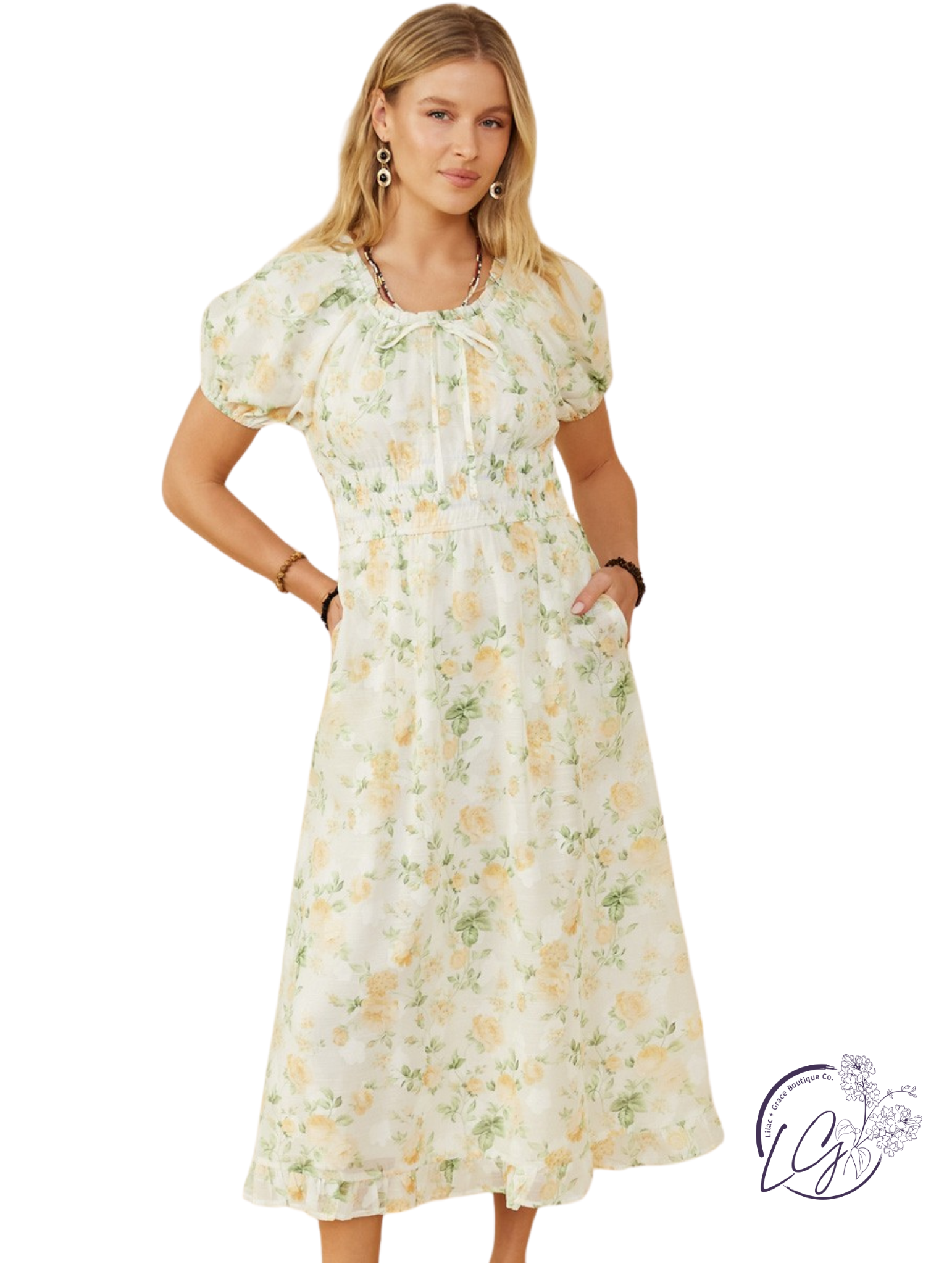 This women's floral dress features a smocked waist for a flattering fit and soft puff sleeves that add a touch of volume and charm. Crafted from lightweight floral print fabric, it offers a flowy silhouette perfect for warm-weather days.