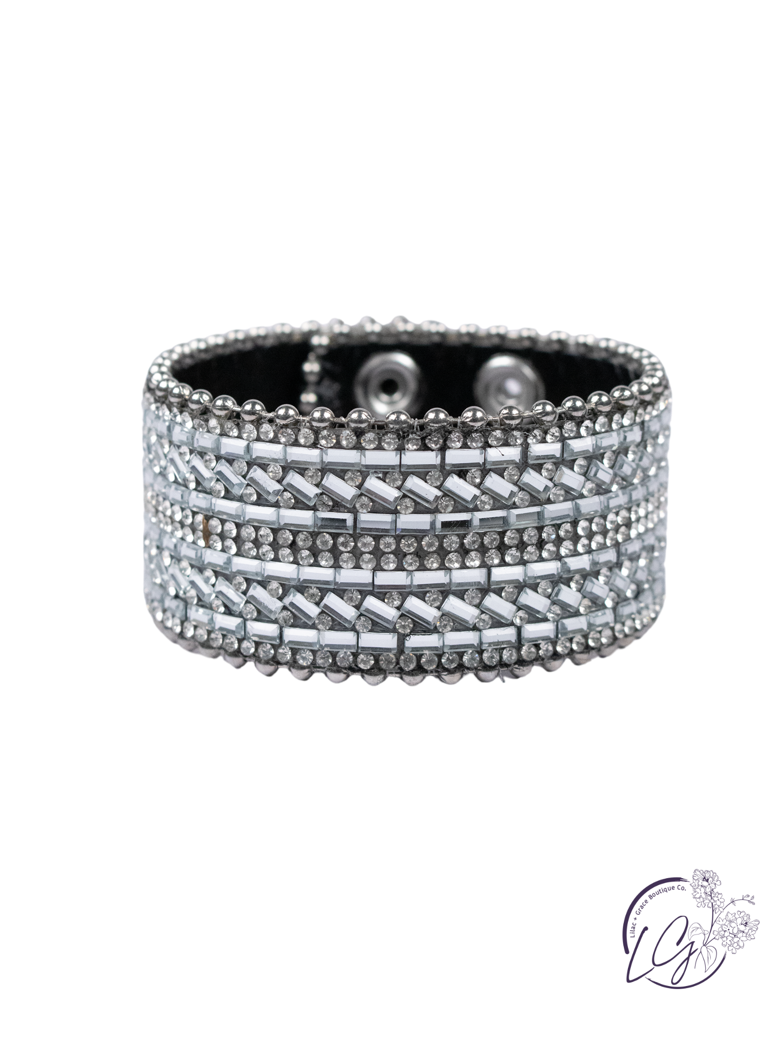 This leather bracelet is lined with rhinestones and metal studs, striking a balance between rugged and radiant. The distressed leather base adds texture and edge, while the shimmer brings in a touch of contrast.