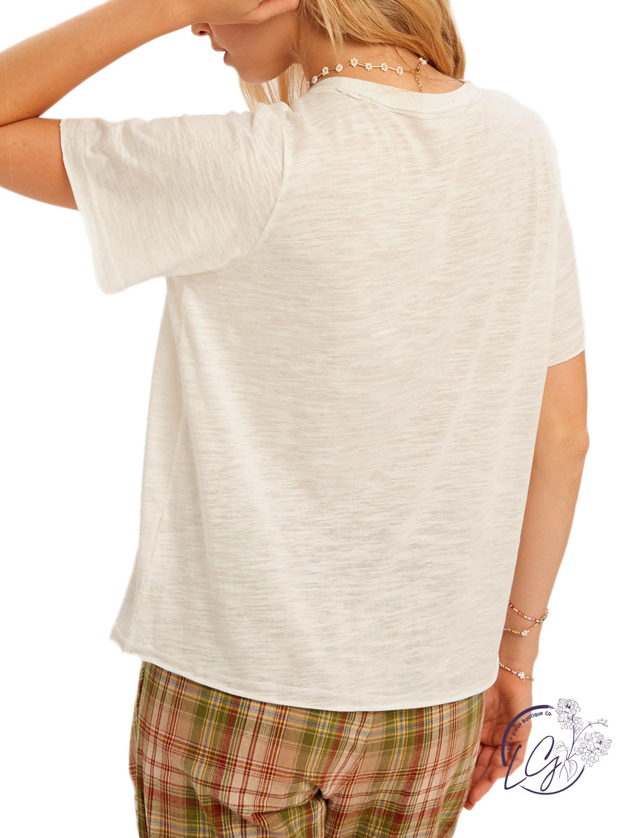 Slightly washed out look printed Knit top that reads "EVERYTHING IS ALRIGHT" with a smile face