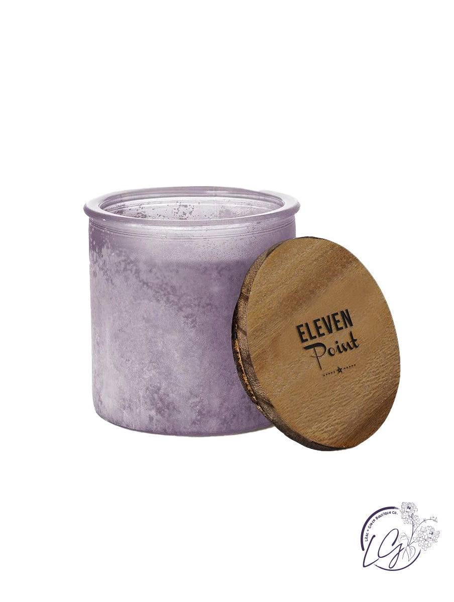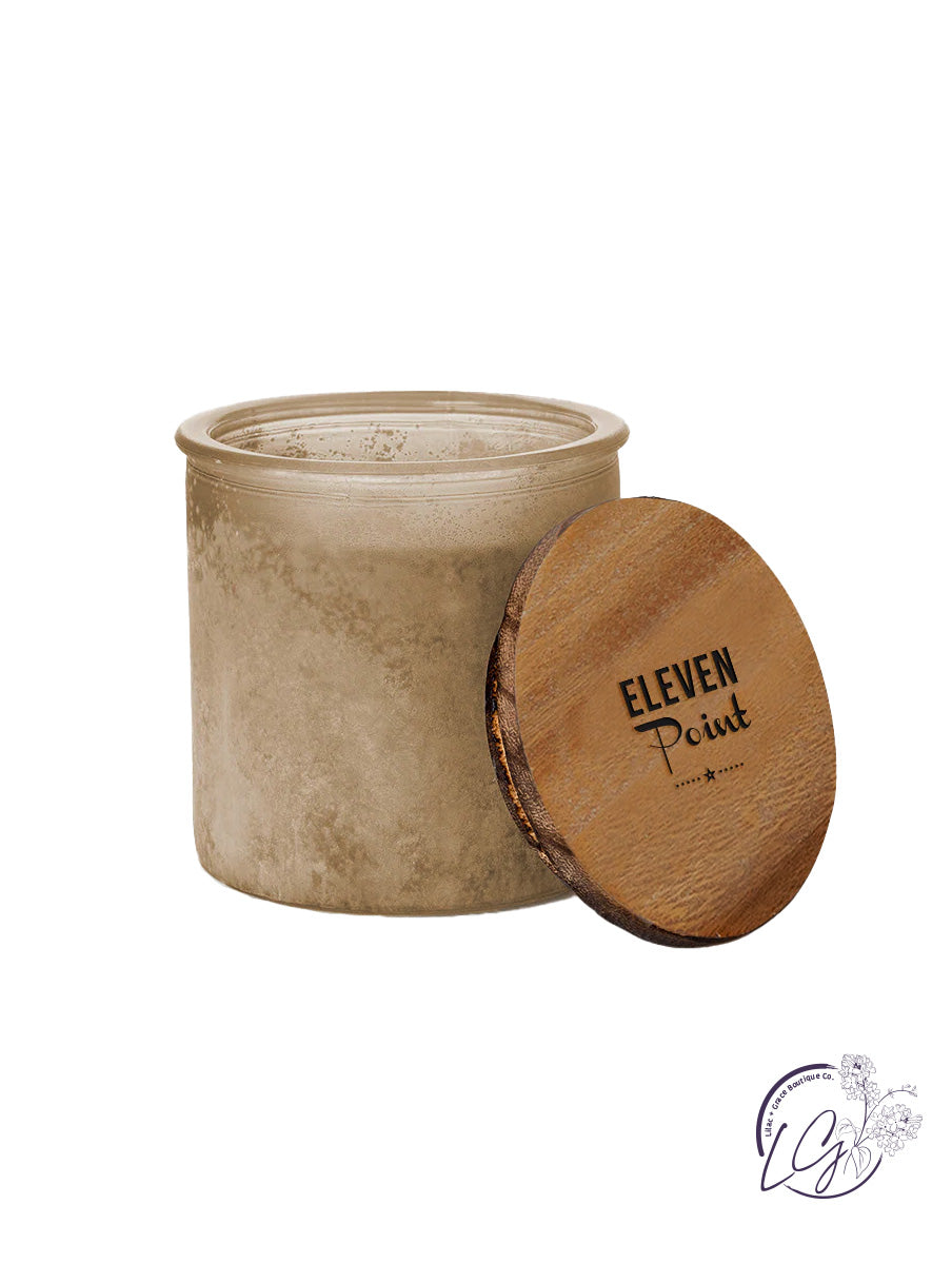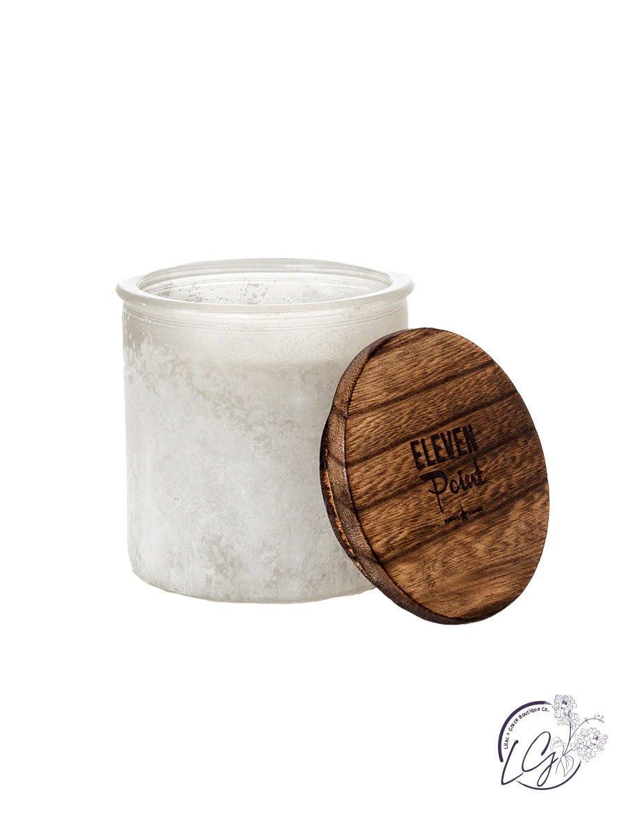 Hand poured, 14 oz soy blend candle, in a large glass with a weathered colored stone finish, topped with a wooden lid (4 x 4).