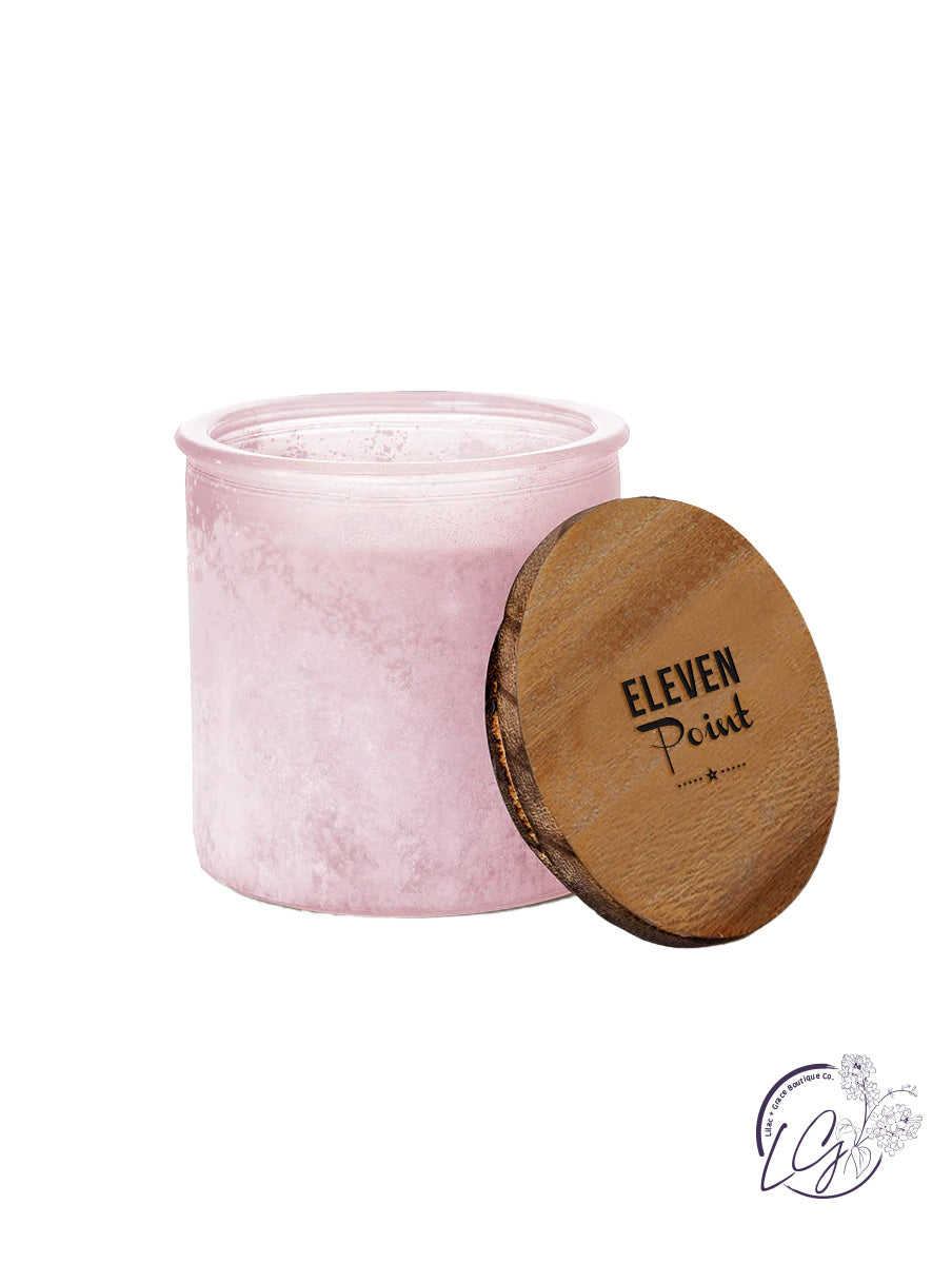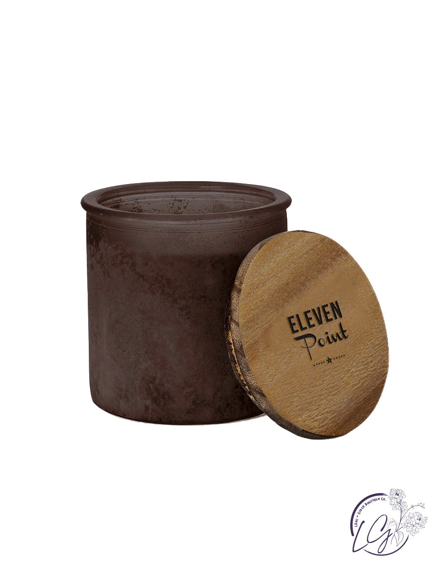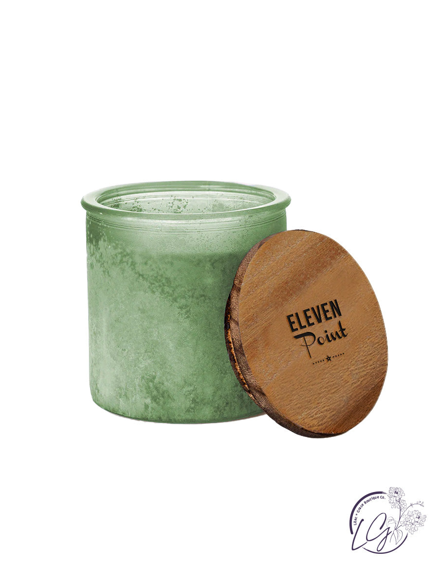 Hand poured, 14 oz soy blend candle, in a large glass with a weathered colored stone finish, topped with a wooden lid (4 x 4).