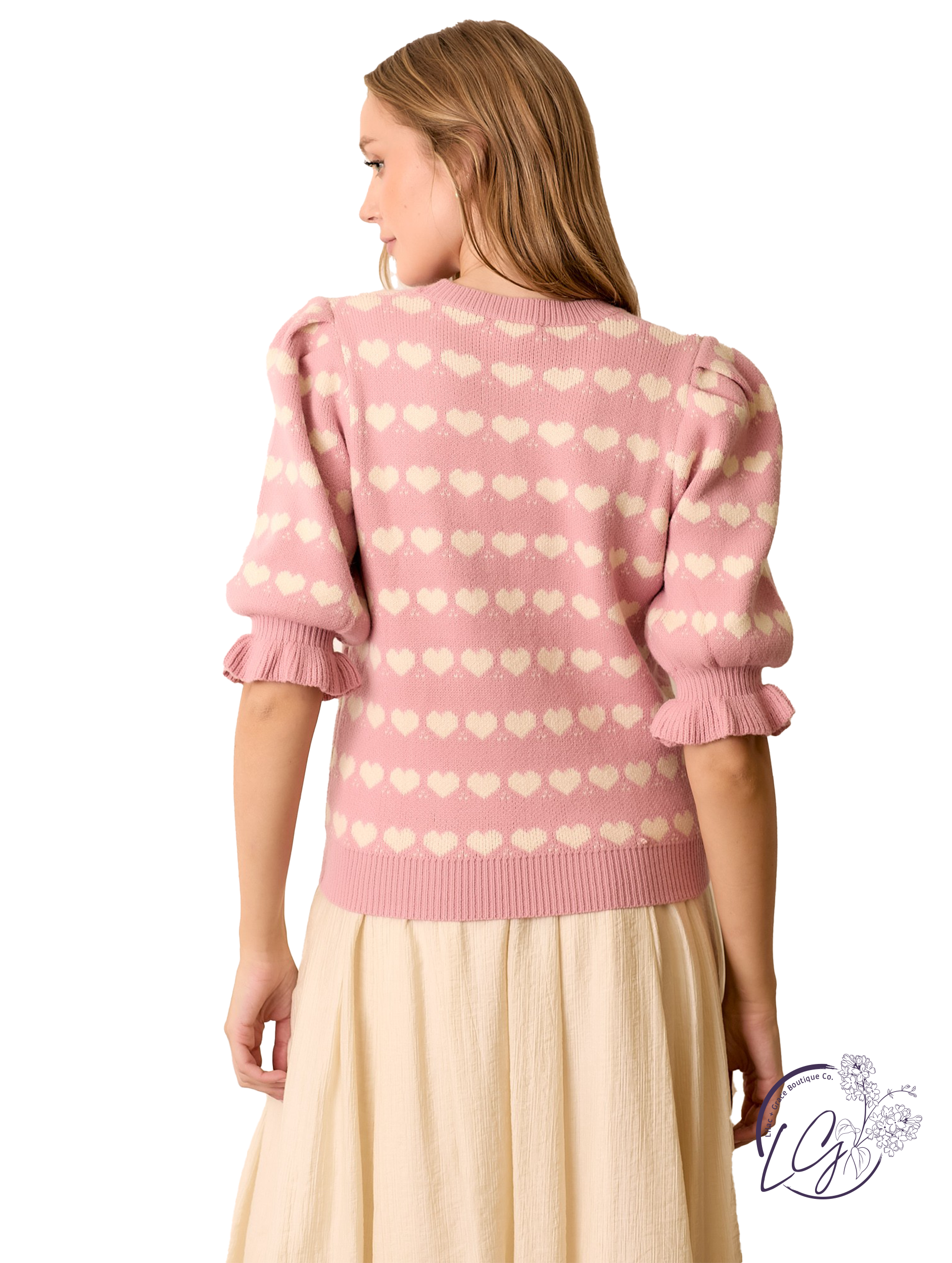 Add playful energy to your style with this heart-printed stripe sweater. Featuring a classic round neckline and short sleeves, it brings a cheerful touch to any outfit. Crafted from soft, cozy knit fabric, this sweater is perfect for layering or wearing solo. Pair it with your favorite denim and sneakers for a casual daytime look, or style it up with a skirt and flats for a charming, feminine vibe.
