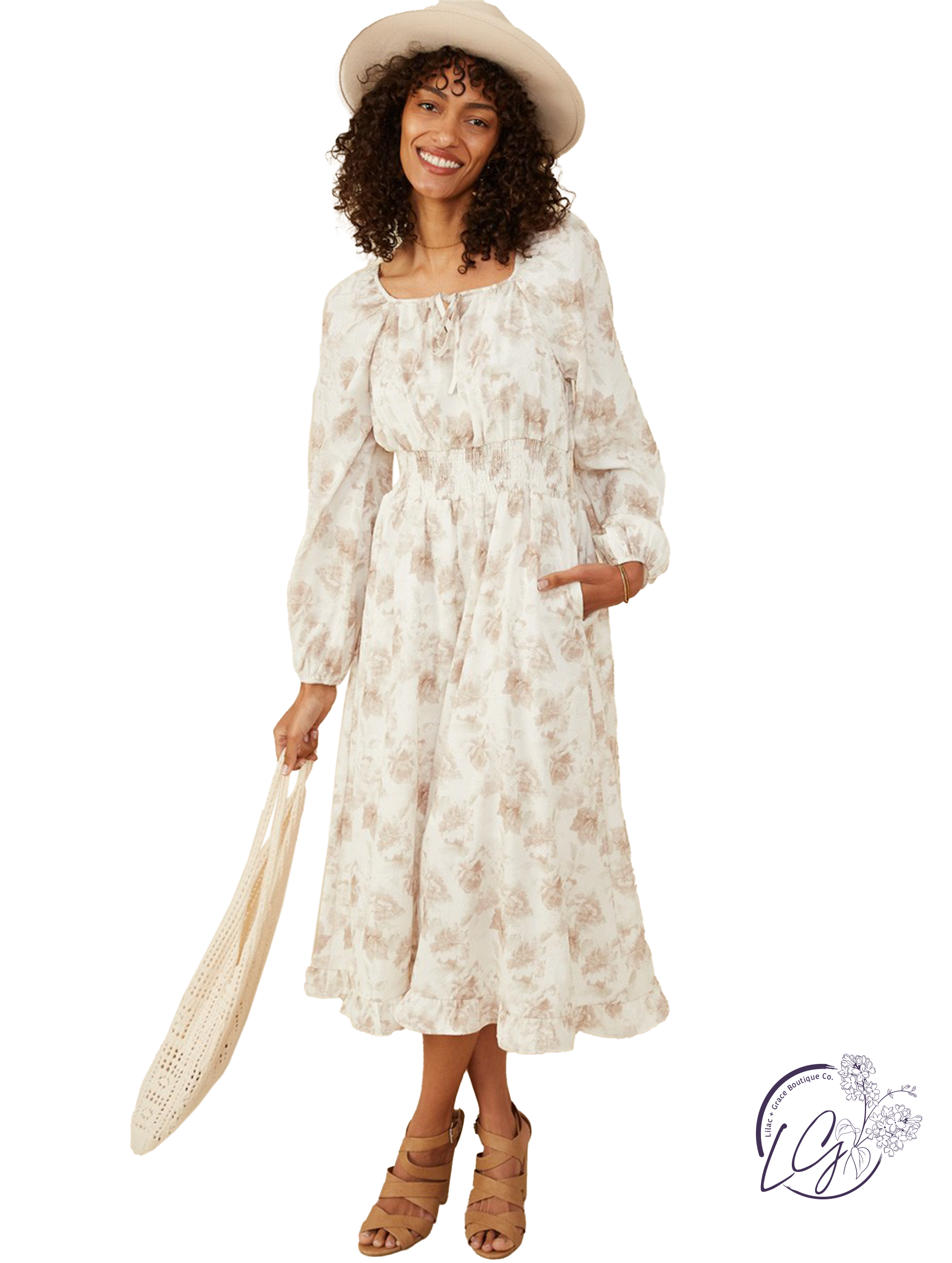 This dress will make a statement with its textured floral print fabric and square-cut neckline. But it's not just about looks - the smocked waist provides a comfortable and flattering fit. Perfect for any occasion, this dress fills the air with beauty and elegance.