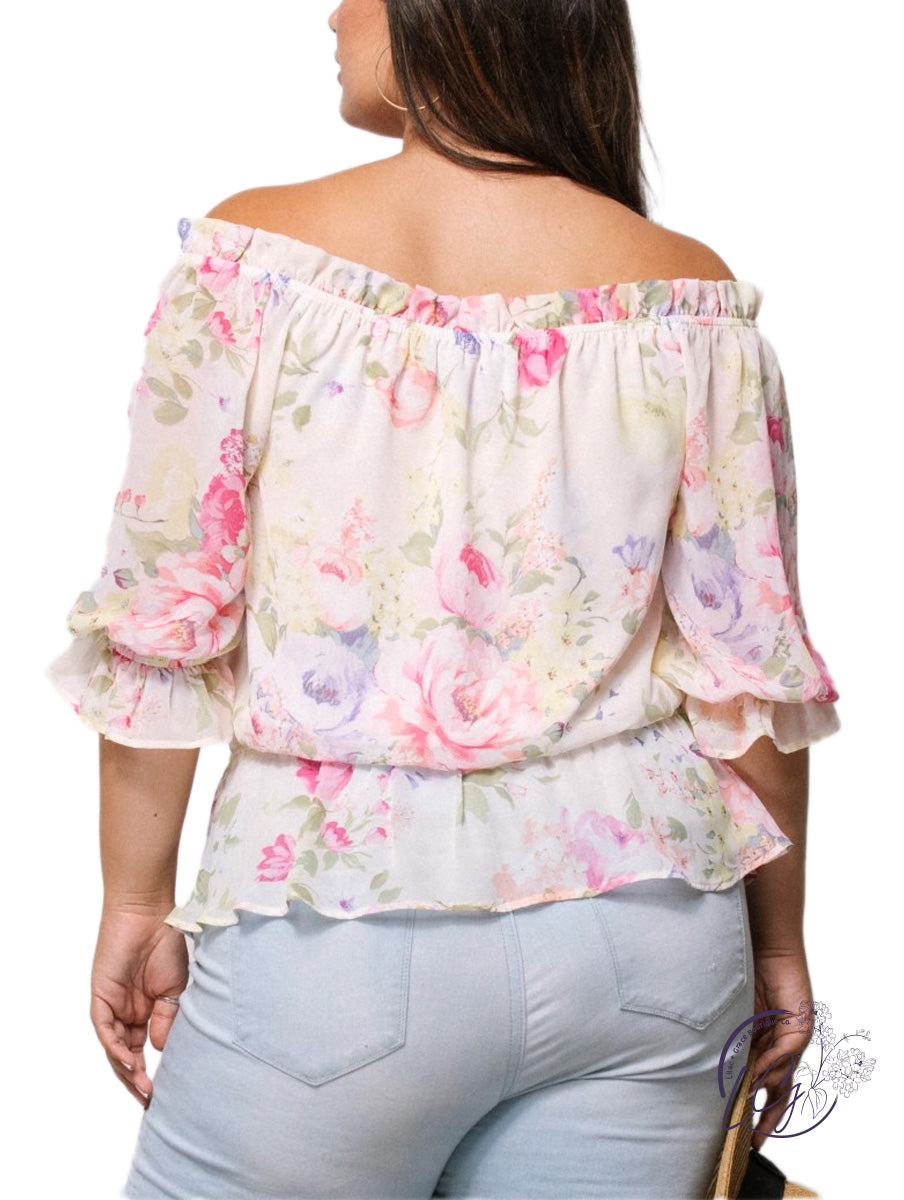 Floral chiffon off shoulder blouse  featuring blouson sleeves with elastic cuffs and smocking waist detail.
