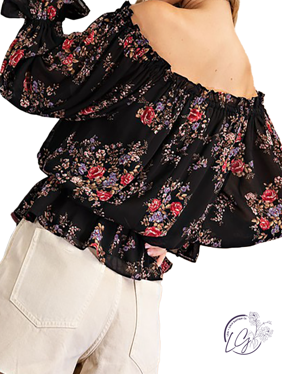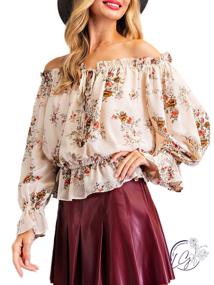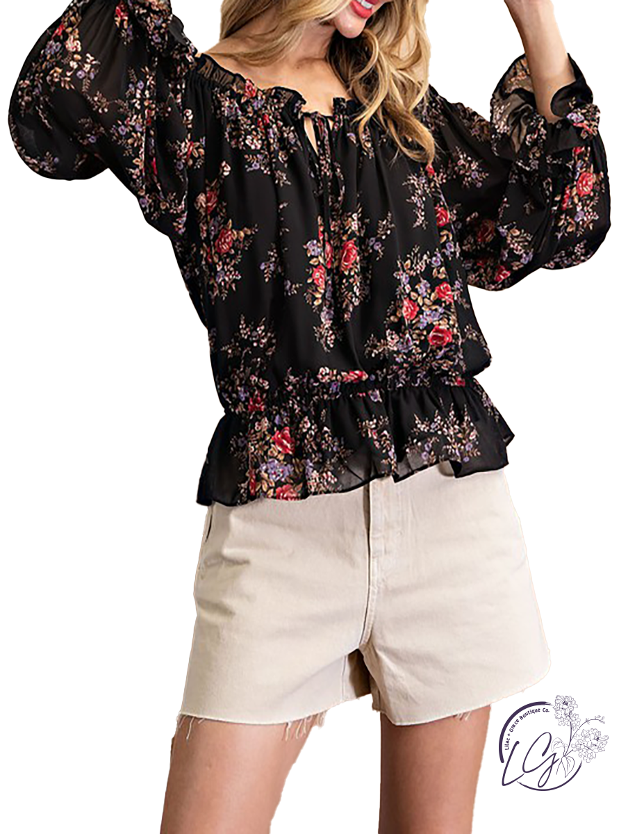 Floral print blouse top with tie front and cinched waist detailed with ruffle accents along the neckline, cuffs and hem.