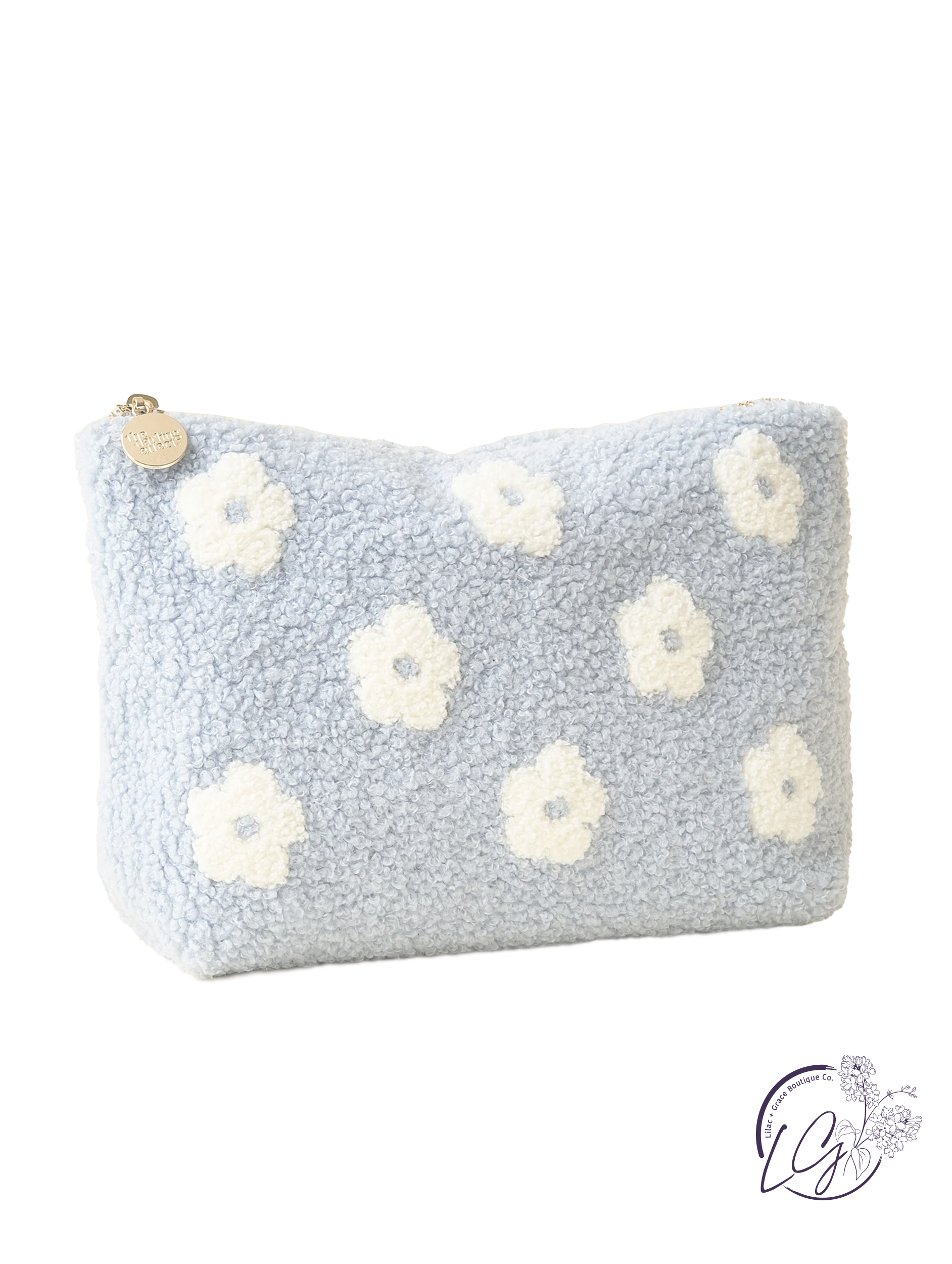 This Flower Teddy Pouch is the perfect way to add a touch of style and sweetness to your everyday routine. Made from soft sherpa material with flower details, it features an adorable gingham lining on the inside and gold zipper details. Plus, it pairs perfectly with the square pouch for added convenience and functionality.