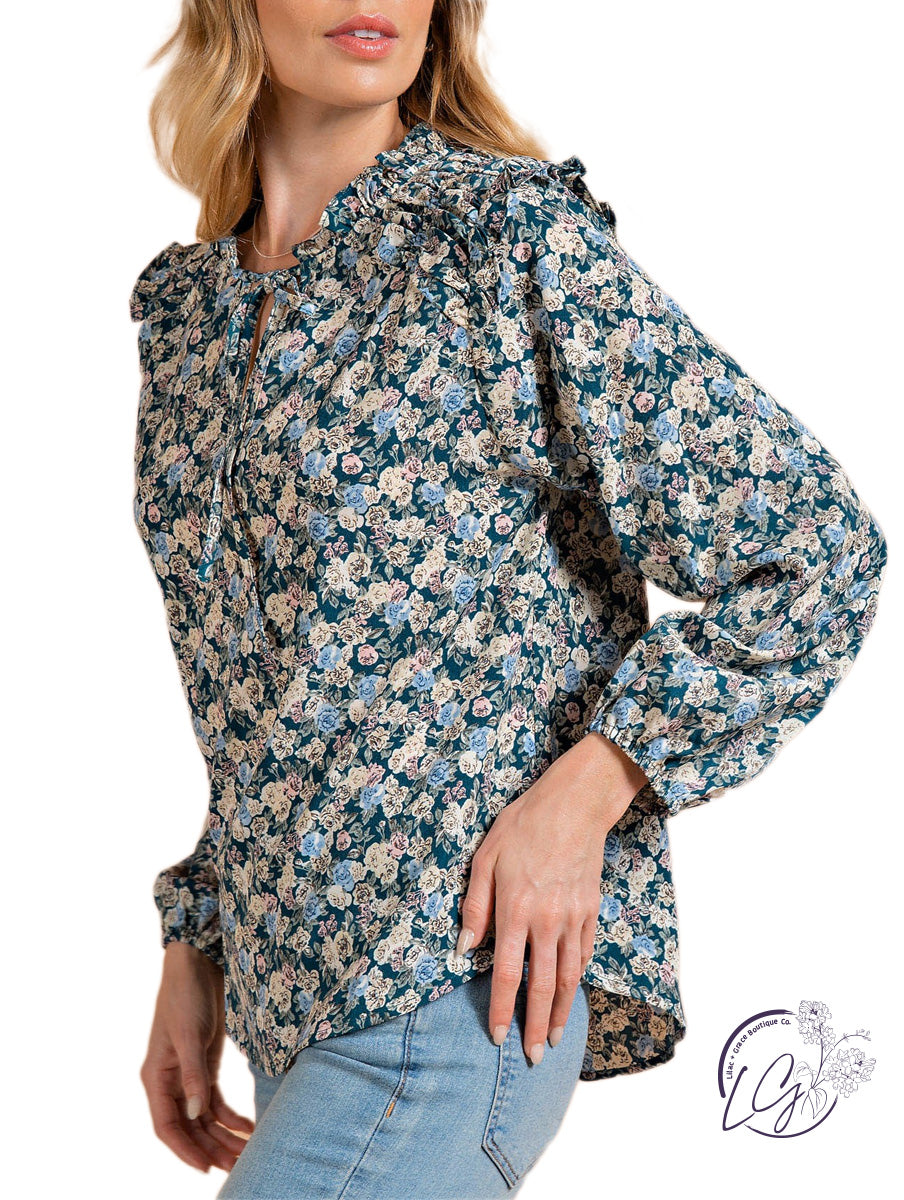 The tie-neck neckline is a defining element of the "Floral Fantasy Tie-Neck Blouse." The tie-neck detail creates a bow or knot at the front, adding a touch of sophistication and versatility to the overall design. The tie-neck can be adjusted to your preferred fit, allowing you to style the blouse to suit different occasions.