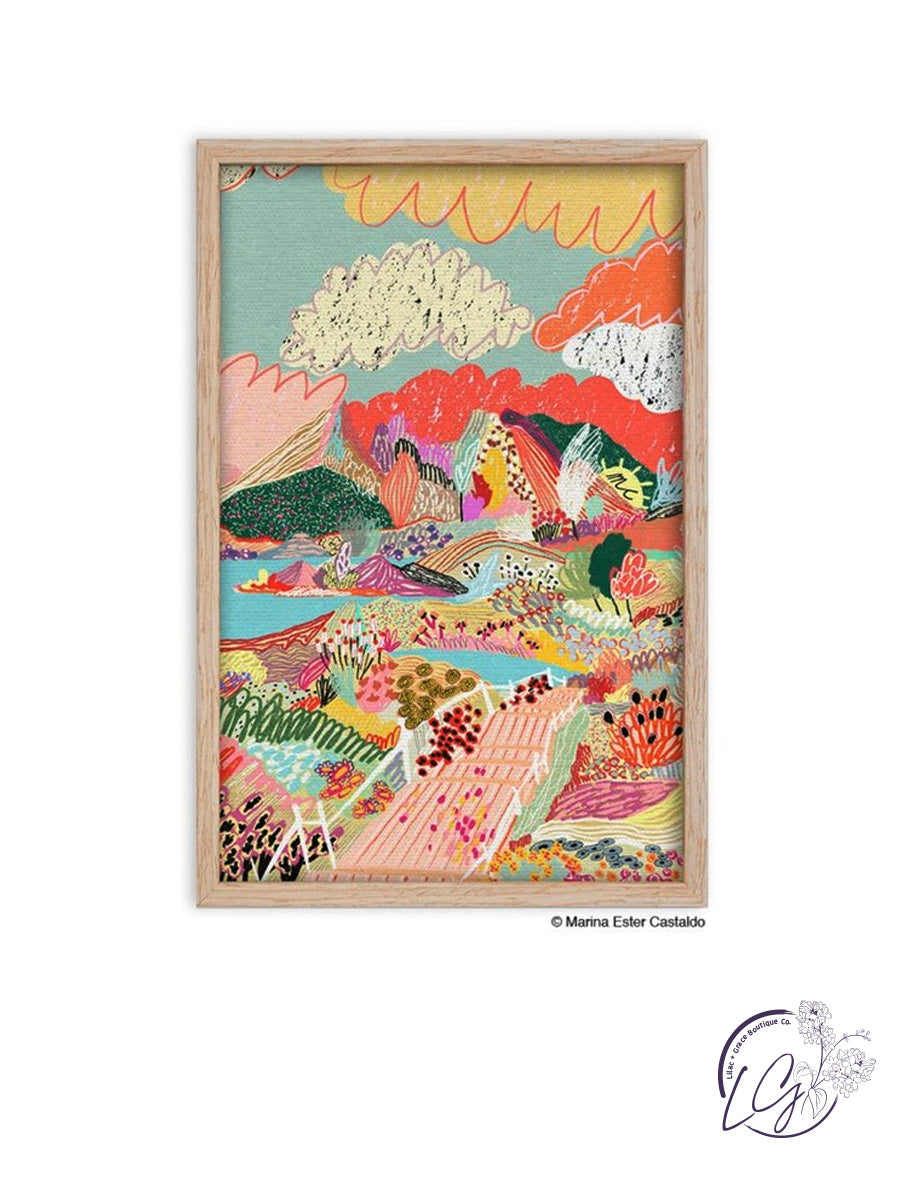 Art perfect for every room! Framed canvas art featuring a canine celebration by Emily Reid.