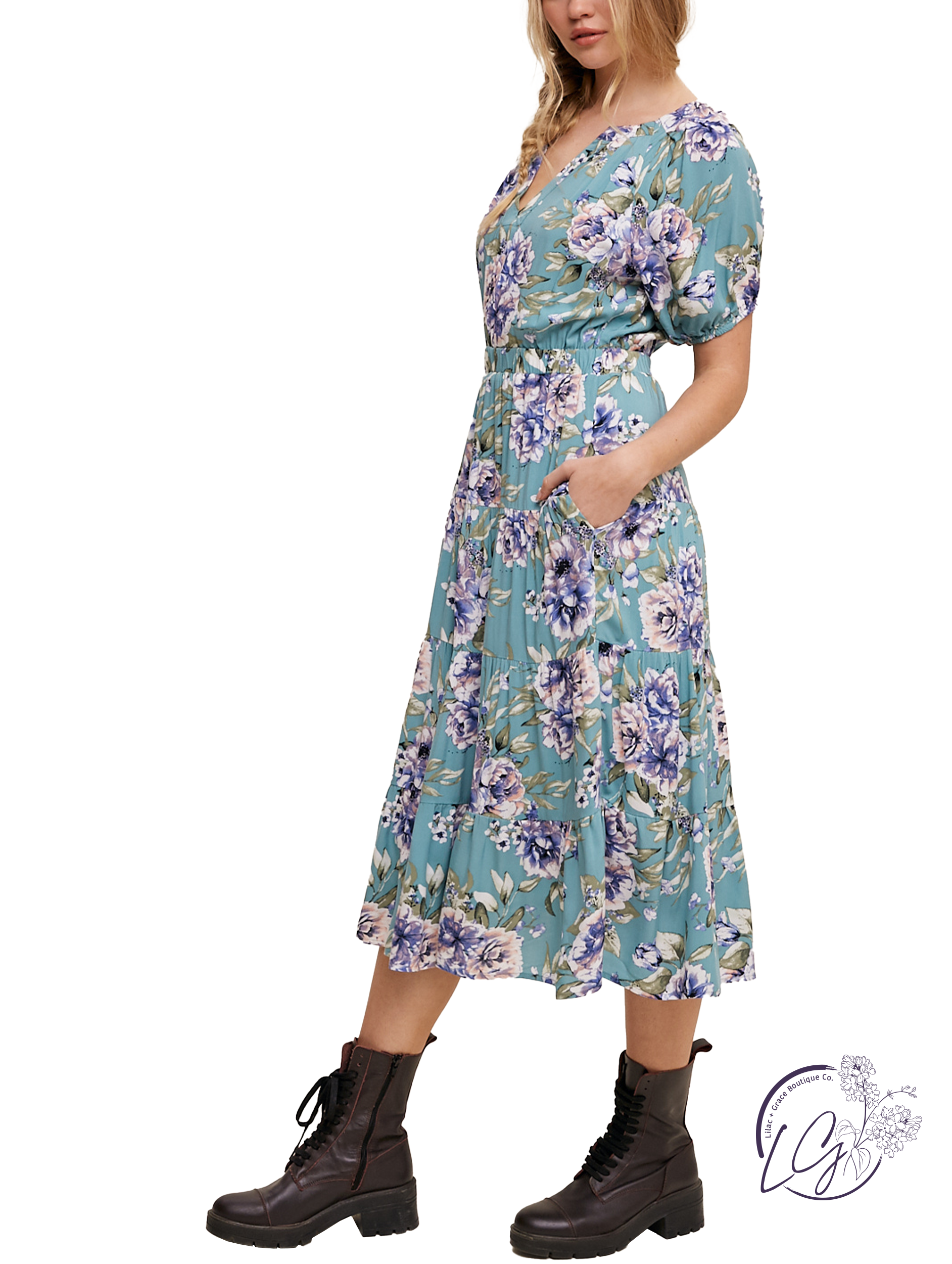 The Floral V-neck Cinched Waist Maxi Dress is a breathtaking ensemble that exudes elegance and charm. Its V-neckline gracefully accentuates the décolletage, adding a touch of allure. The cinched waist creates a flattering silhouette, defining the curves beautifully. Adorned with a delightful floral pattern, this dress brings a touch of nature's beauty to your wardrobe. The flowing maxi length skirt adds a sense of romance and sophistication, making it perfect for both casual and formal occasions.