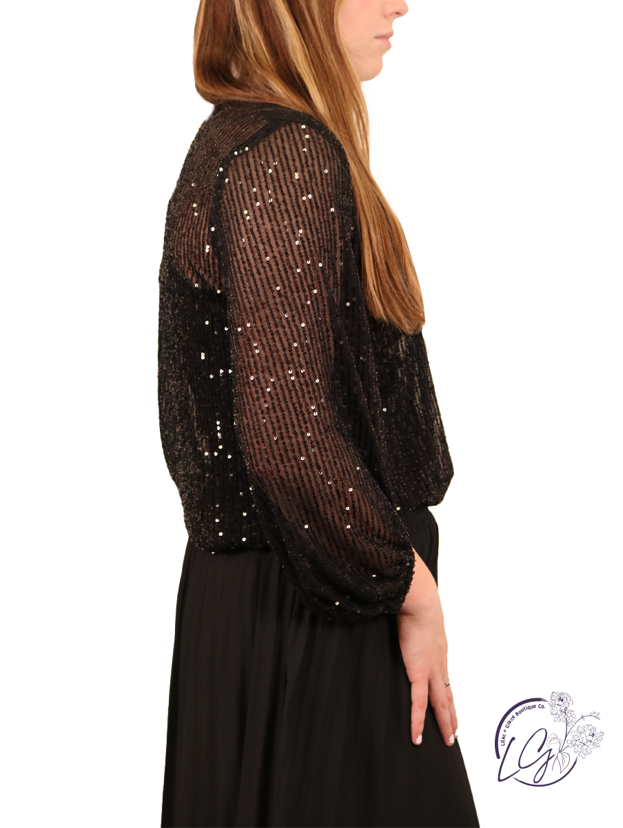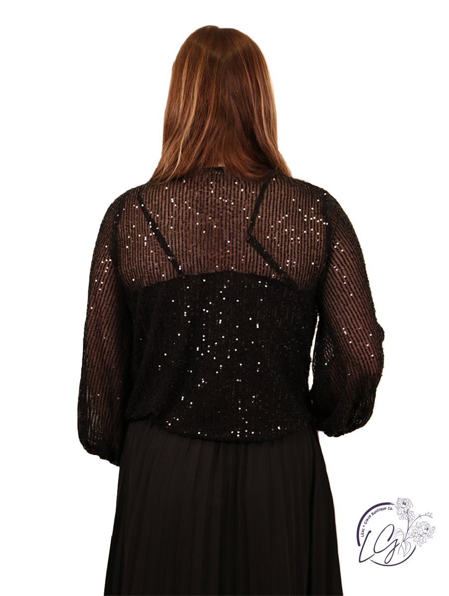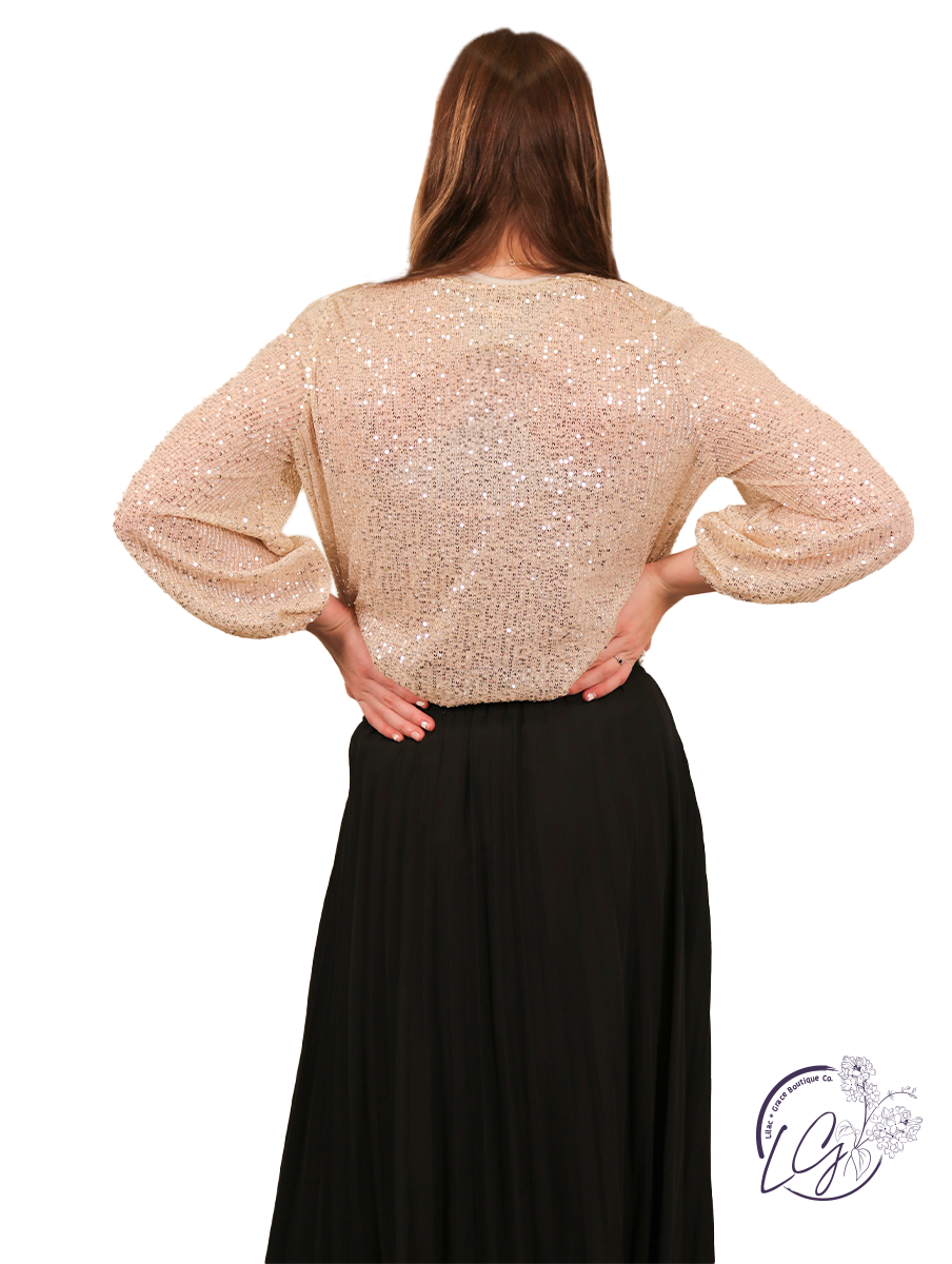 Step into the spotlight with the "Glimmer Glamour Long Sleeve Blouse," a dazzling and sophisticated piece designed to add a touch of sparkle to your wardrobe. This blouse is the epitome of understated elegance, offering a perfect balance of glamour and refinement.