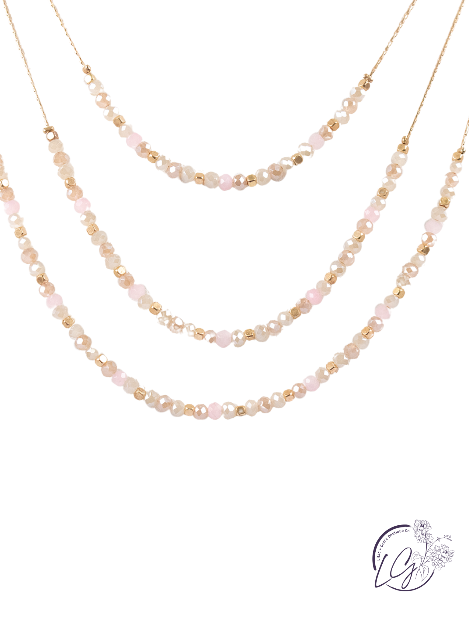 This enchanting layered necklace features three delicate strands, each adorned with a graceful array of rose-pink and gold-toned beads. The beads vary subtly in shade and finish, creating a captivating sparkle and depth. The shortest strand rests elegantly near the collarbone, with the subsequent strands cascading downwards, creating a beautifully graduated effect.