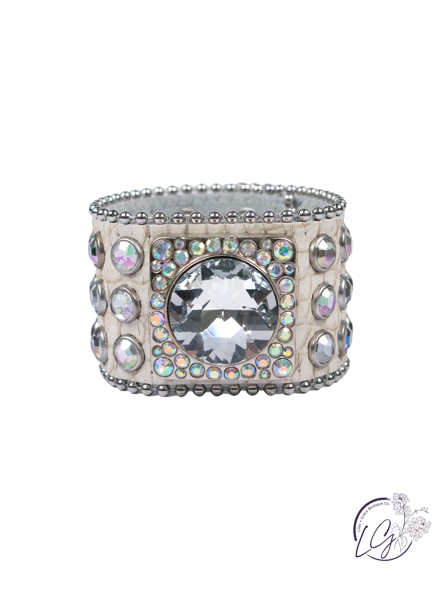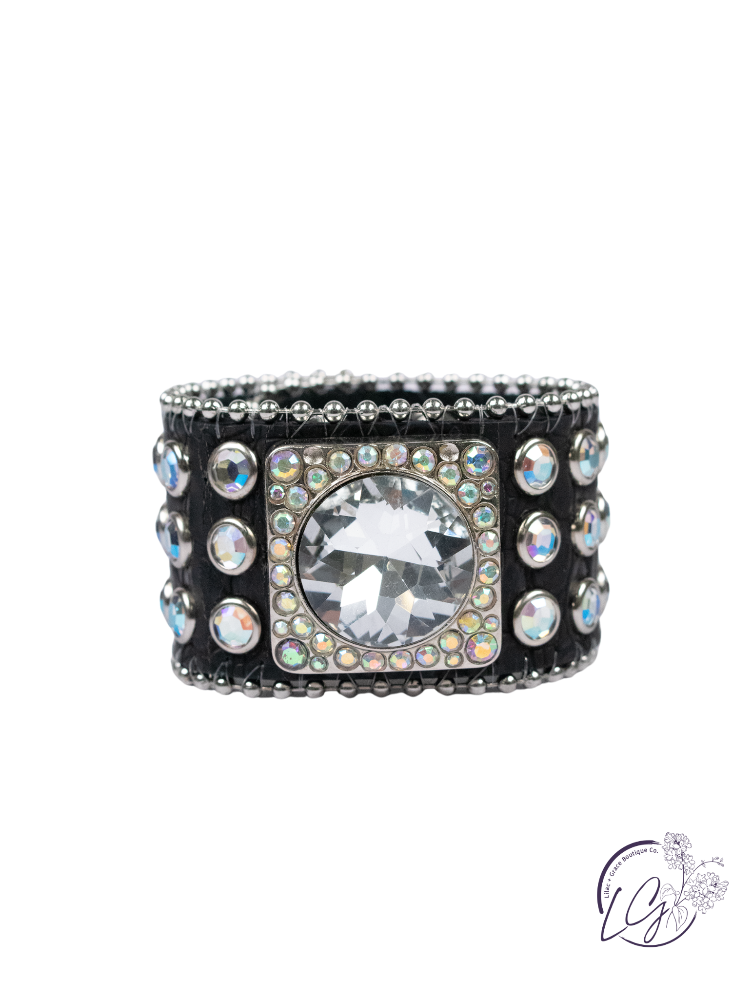 This leather cuff brings raw edge and shine together, with rows of rhinestones set into a wide, structured band. The worn leather base gives it a rugged feel, while the studded sparkle adds a flash of contrast.