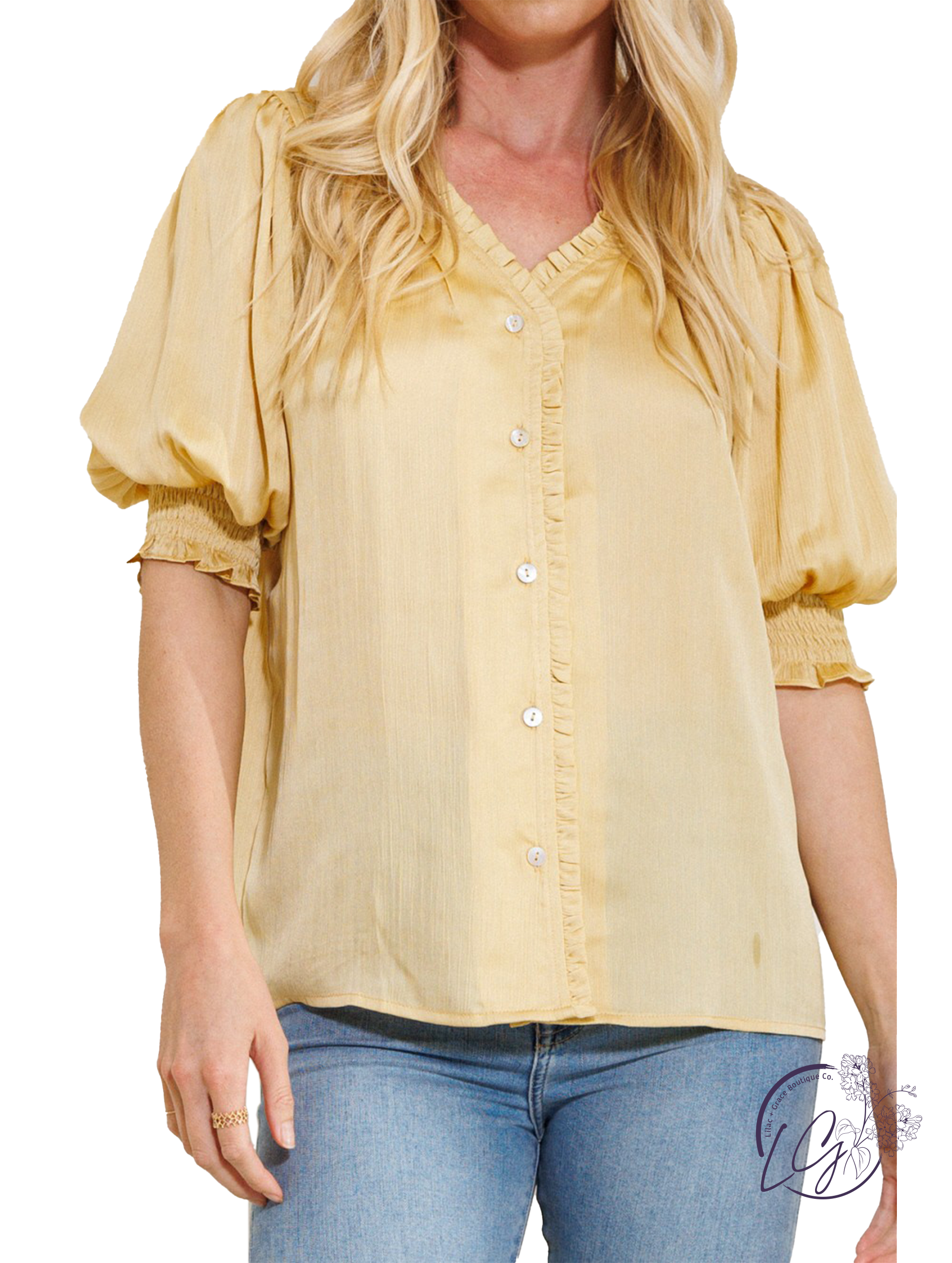 Unleash your daring side with our Sophisticated Sweetness Blouse. The pintuck detail and textured woven fabric add depth to the v-neckline and mini ruffle hem. Embrace your adventurous spirit with puff sleeves and smocked cuffs, perfect for a day of exploration. Take charge and command attention with the front button down. Own your style now!