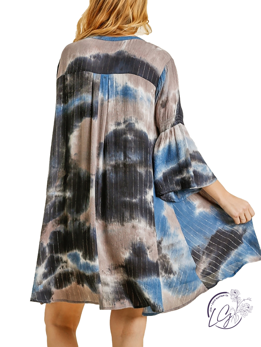 Tie Dye Bell Sleeve Keyhole Dress with Metallic Threading