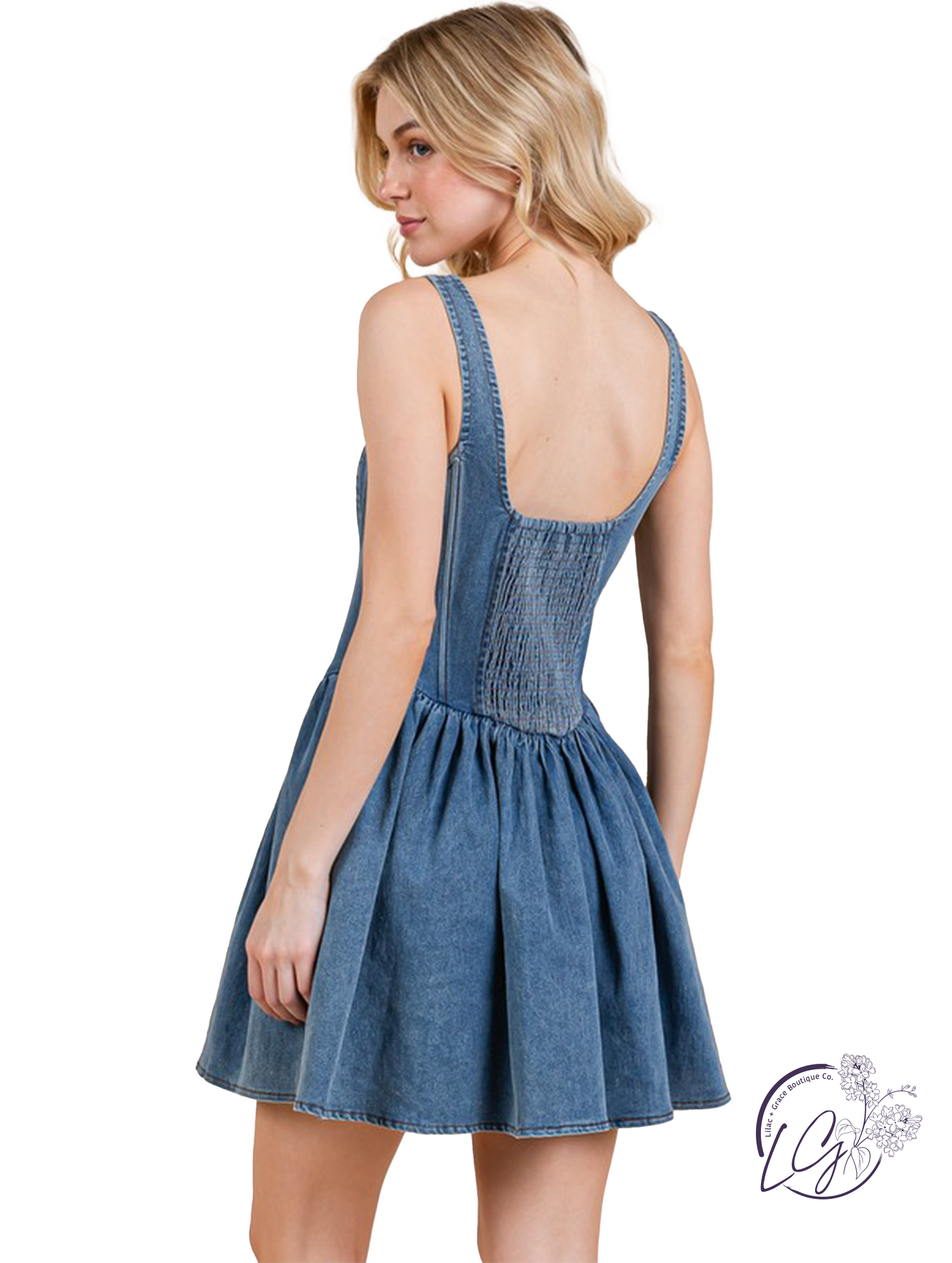 This denim mini sundress is designed in a flattering fit-and-flare silhouette with a playful circle skirt and square neckline. The sleeveless cut is balanced by smocking in the back for a flexible fit and a subtle low-back detail for added charm. Side pockets offer everyday ease, while the lined interior ensures comfortable wear. Perfect for spring and summer days—just pair it with sneakers or sandals for an easy, stylish look.