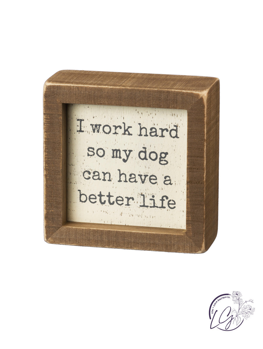 An inset wooden box sign in neutral colorations featuring a typeset "I Work Hard So My Dog Can Have A Better Life" sentiment with a natural wood trim. Easy to hang or can free-stand alone.