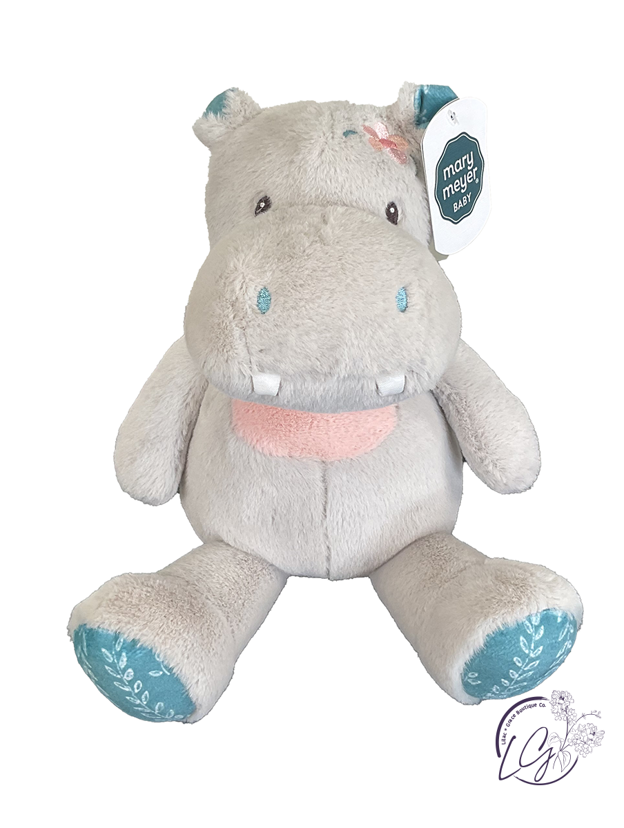 This hippo is dazzling in soft gray, pale pink, jewel tone accents, and embroidery. Subtle, sweet, and unique, this darling makes a welcomed addition to our baby line.