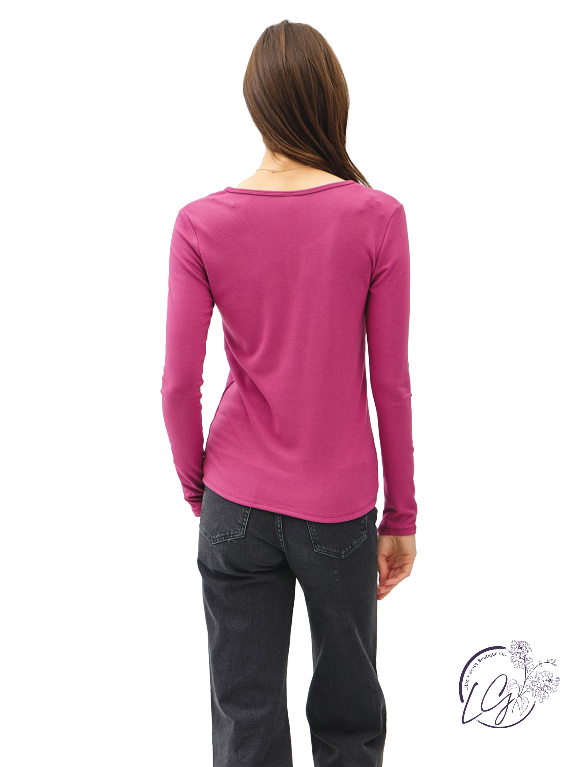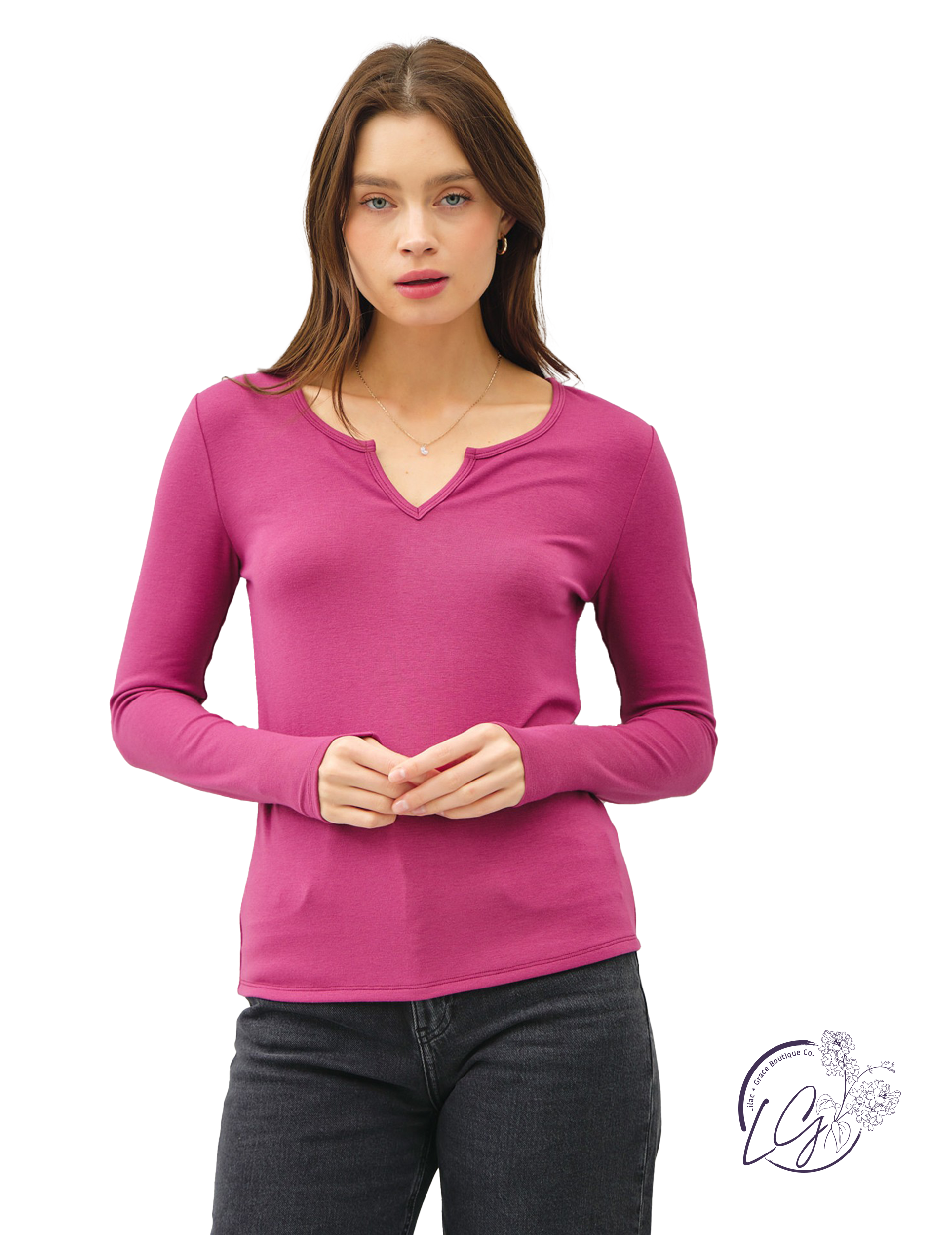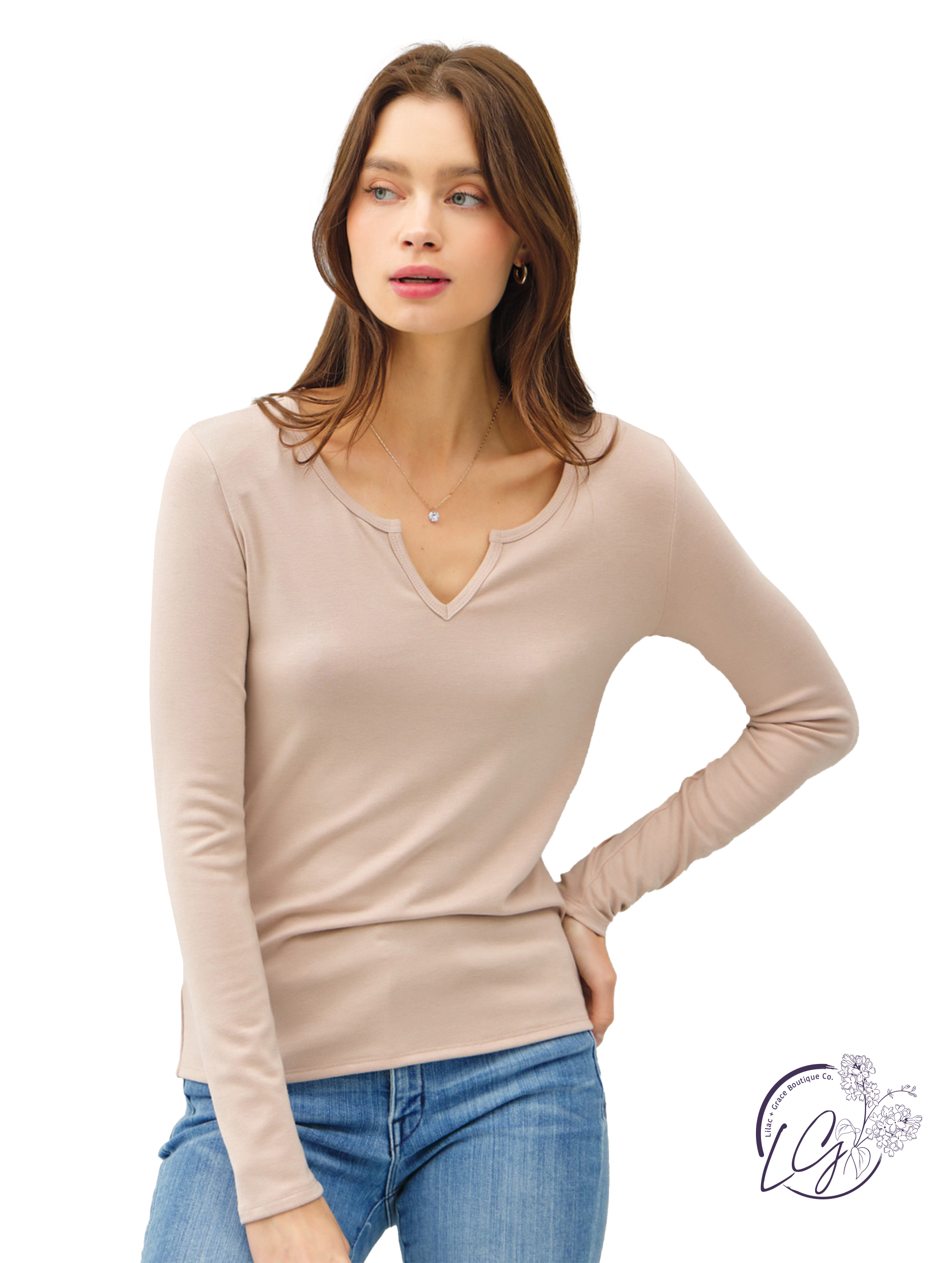 Elevate your wardrobe with the Keep The Faith Knit Tee. Featuring a notched scoop neckline, split neck, and long sleeves, this knit tee is a must-have basic. With a regular slim silhouette and relaxed fit, it's both versatile and flattering. Perfect for transitioning between seasons, the soft and stretchy material ensures comfort all year round.