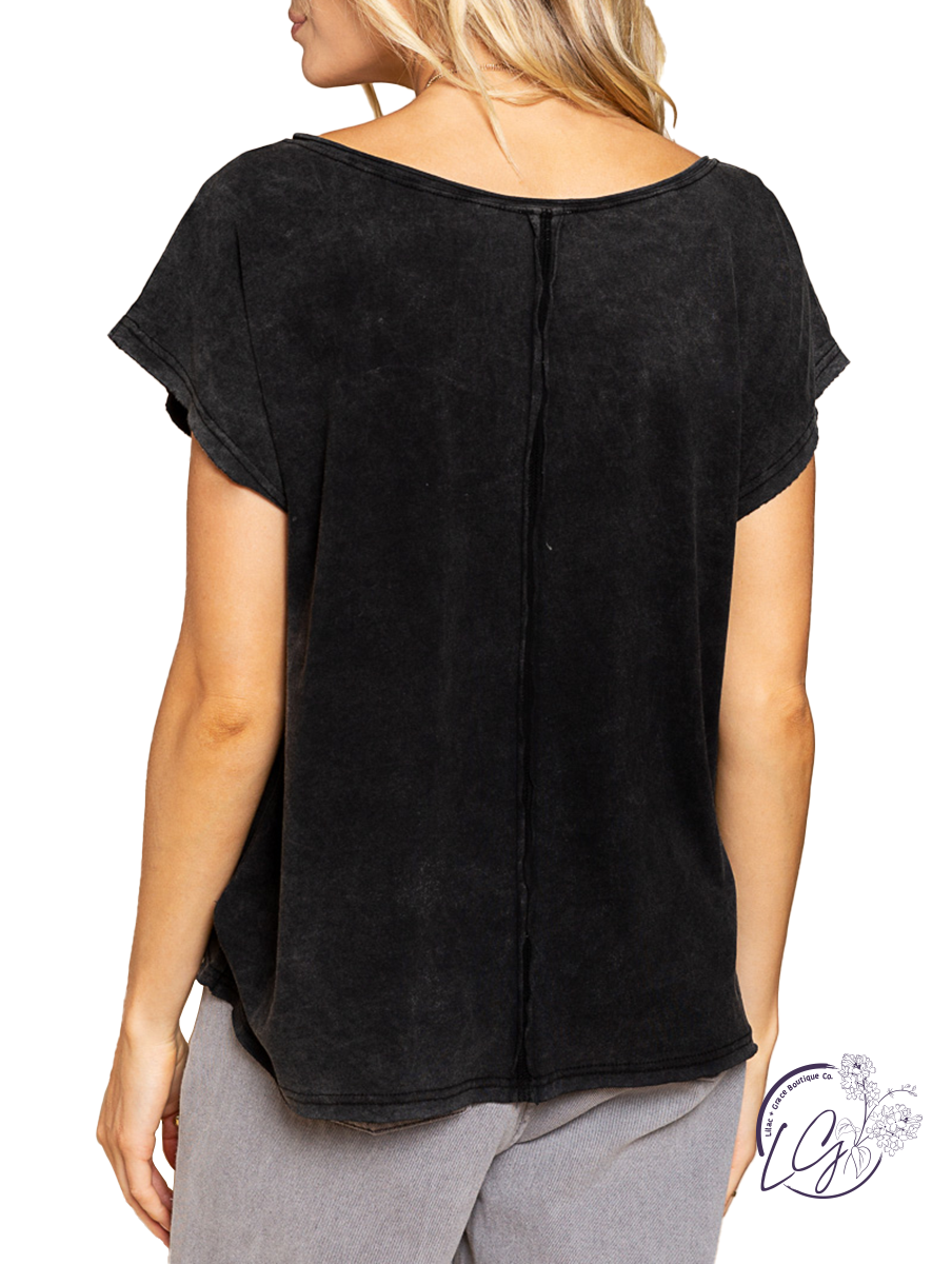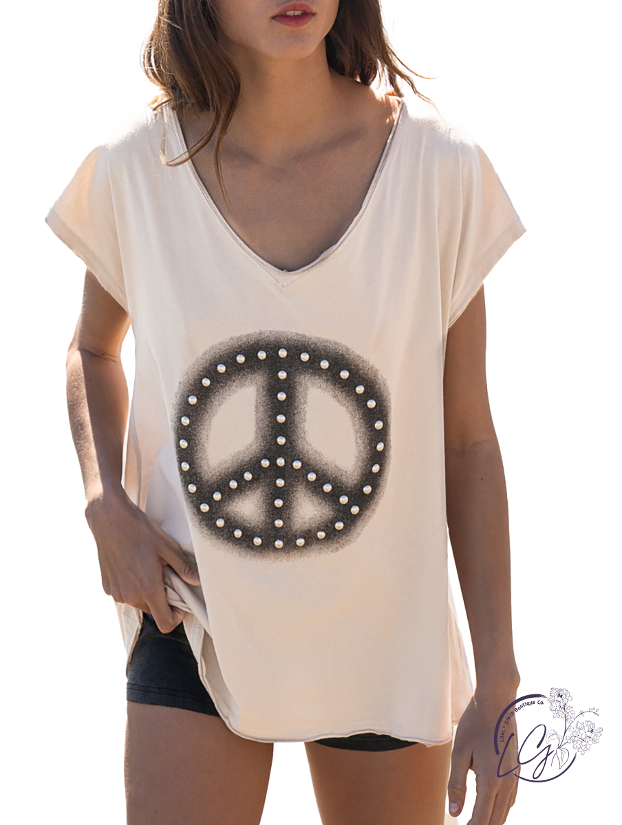 Designed in V-neckline knit top, short sleeve length with raw edge, stud detailing along the peace print, seam out with raw edge on the center back. featured in cotton jersey