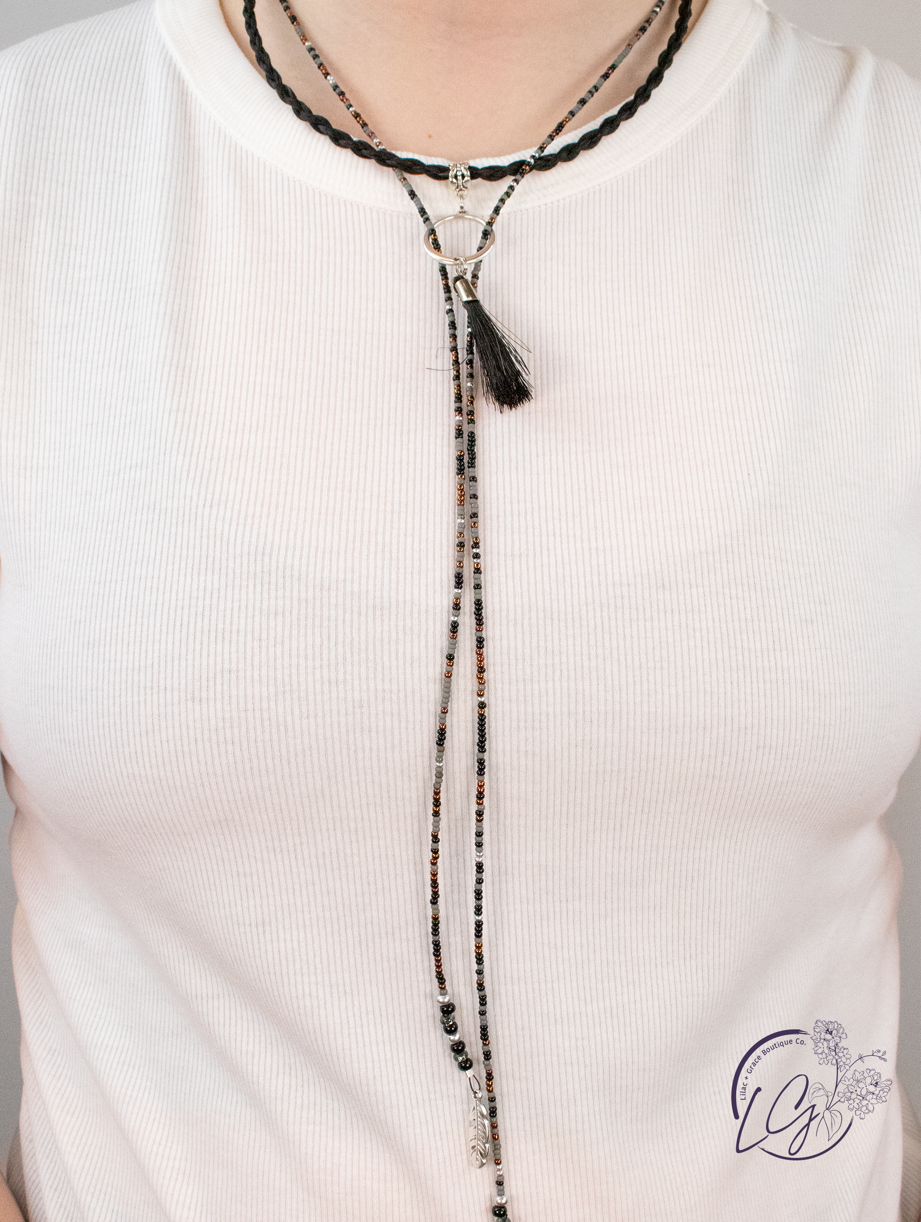 Lariat Necklaces feature a loop braid of horse hair with long strands of colorful seed beads that pass thru a “hondo”, accented with a tassel of horse hair. The bead strands are finished with tiny charms. These necklaces adjusts from 16 to 20” with the chain and lobster claw closure. Four color combinations to choose from. Dally up these unique necklaces!