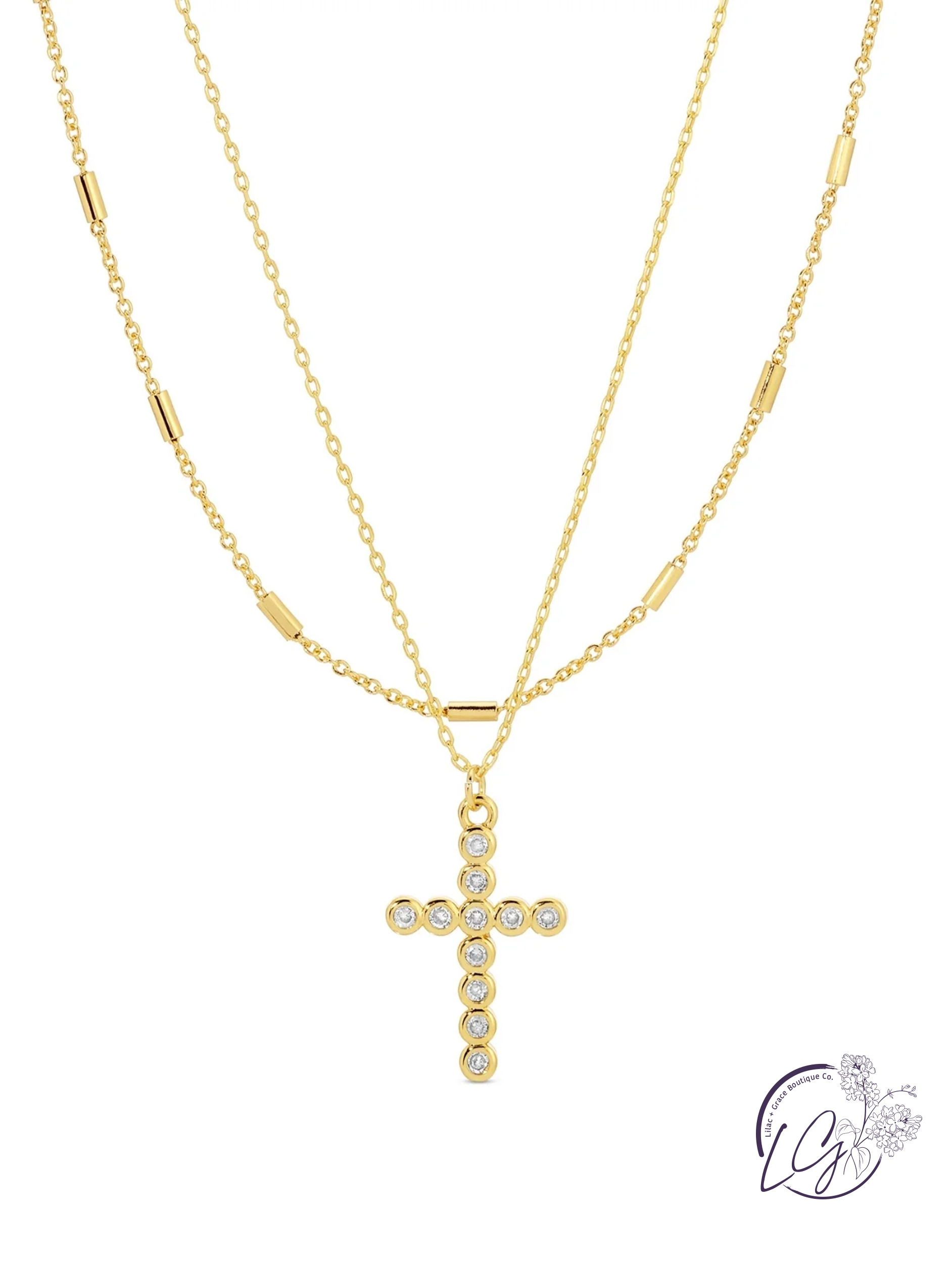 A dual-layer necklace featuring a basic chain with a subtle accent and a second chain adorned with a cubic zirconia cross.
