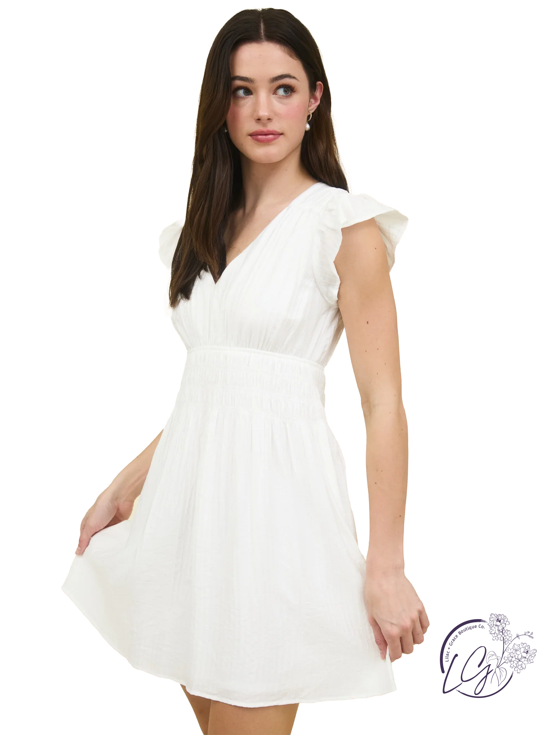 Soft and feminine, this solid mini dress features a classic v-neckline, ruffle-trimmed sleeves, and a shirred elastic waist that flatters the figure without compromising comfort. Fully lined for ease of wear, it's the perfect throw-on piece for warm days or casual nights.