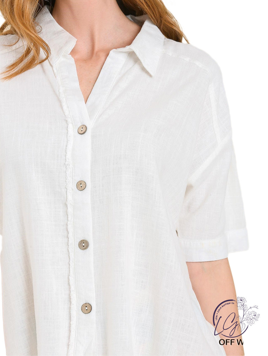 The collar adds a touch of refinement to the otherwise casual design, creating a balanced look that can seamlessly transition from casual to semi-casual occasions. The frayed detailing along the hem introduces a hint of undone charm, providing a stylish edge to the overall aesthetic.