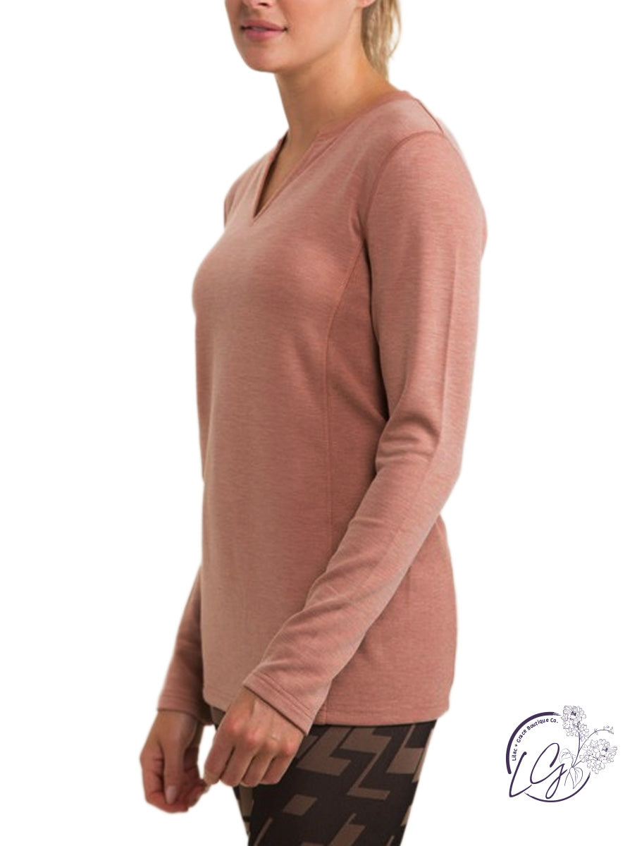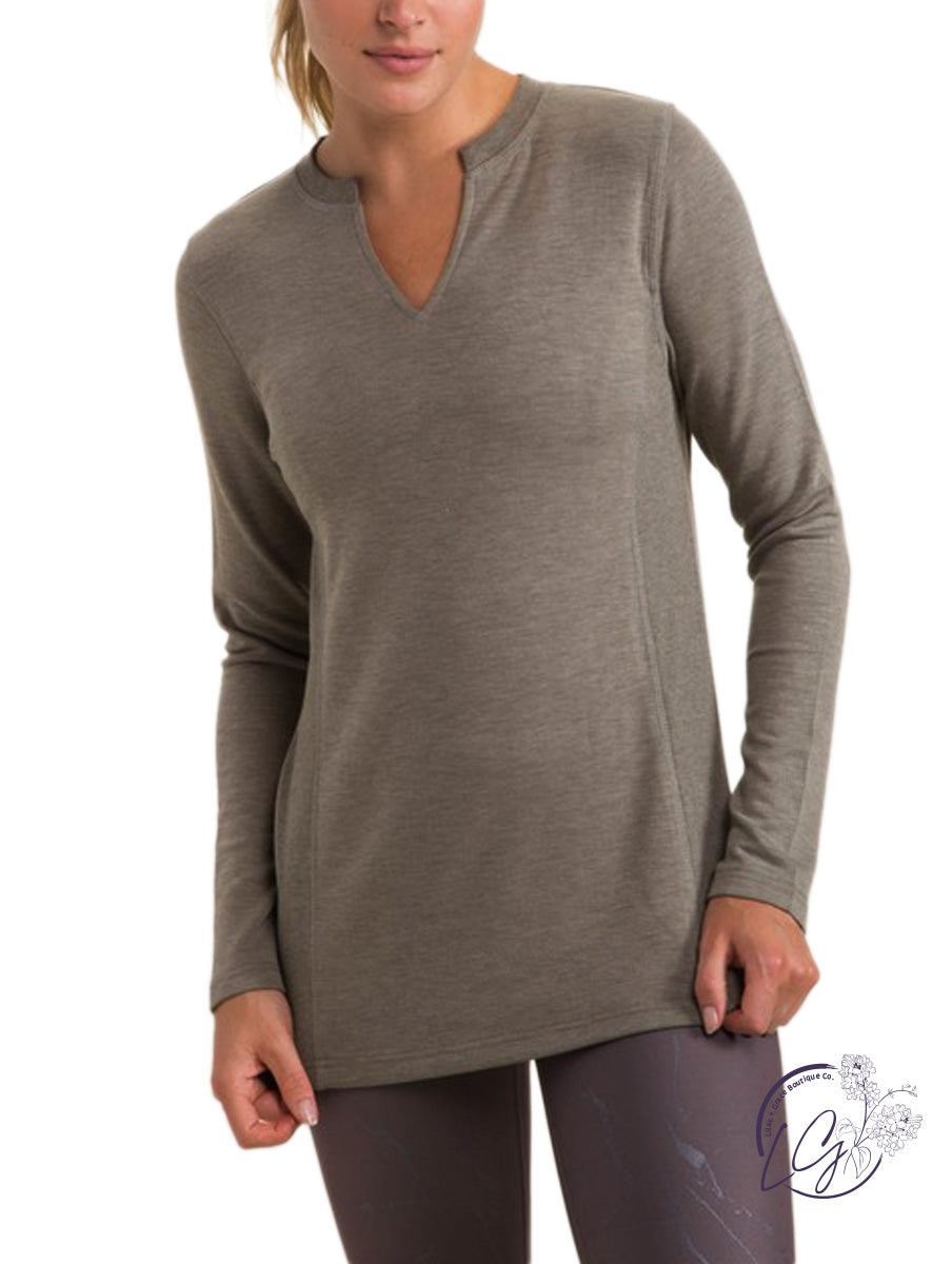 This top features strategic placement of the side panels to create a flattering and slimming silhouette. It also comes with a ribbed collar, long sleeves, and raw accents around the armholes and panels.