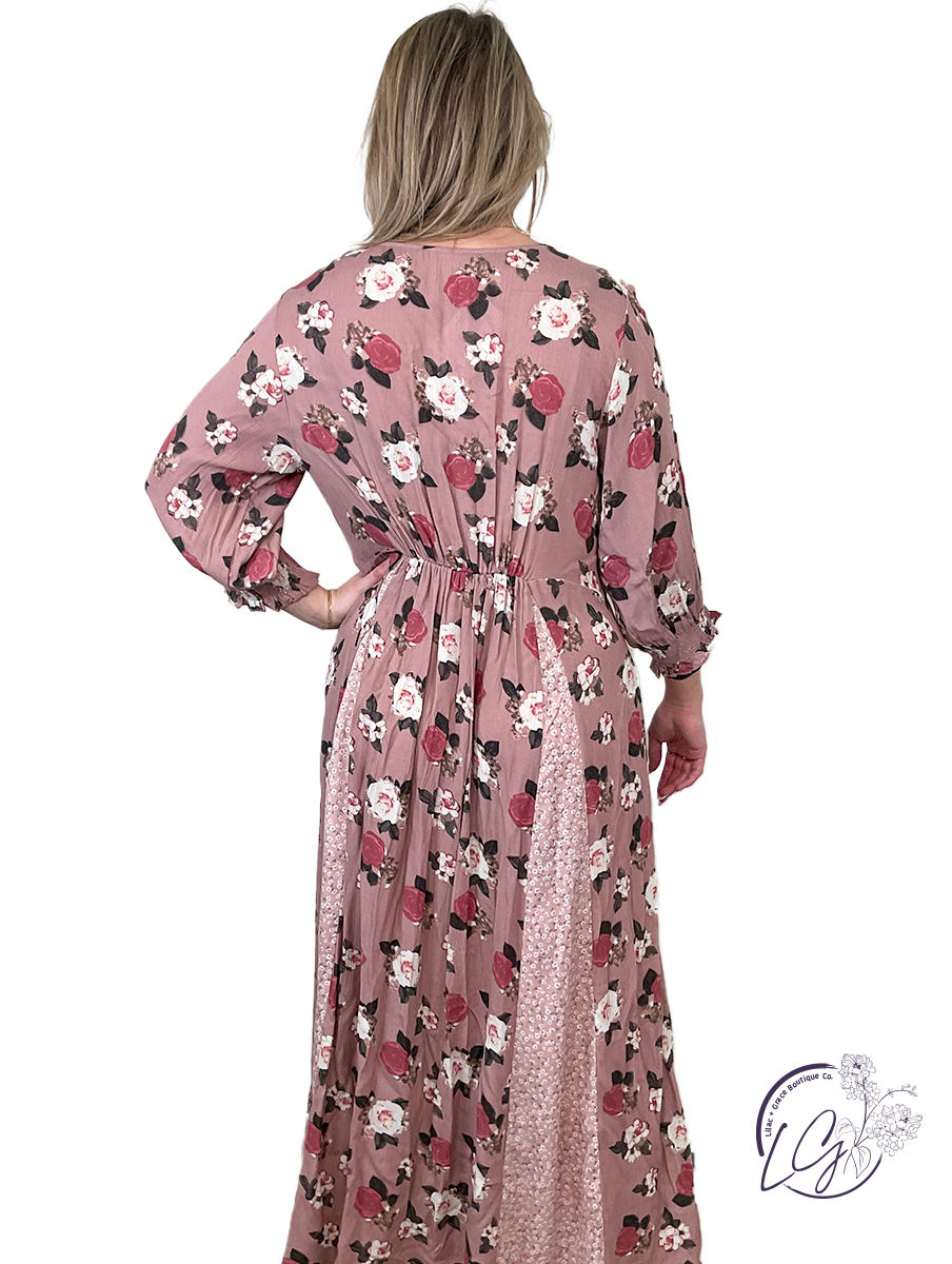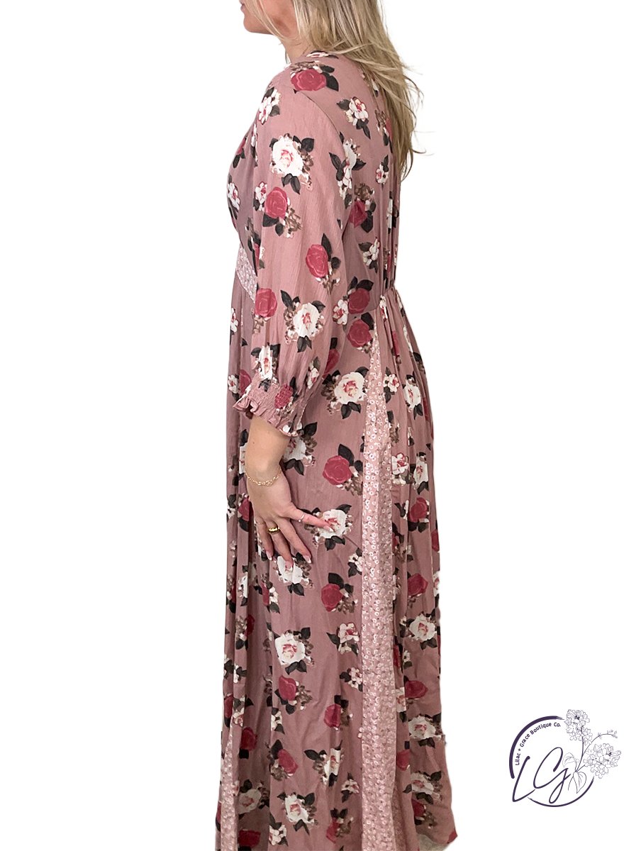 Mixed Floral Print V neck 3/4 Ruffle Smocked Cuff Sleeve Maxi Dress with Pockets