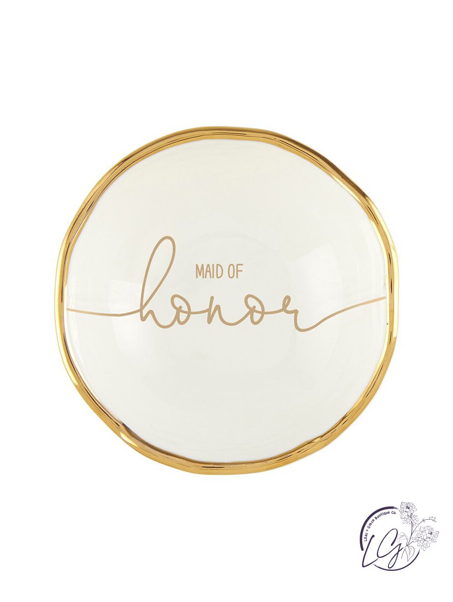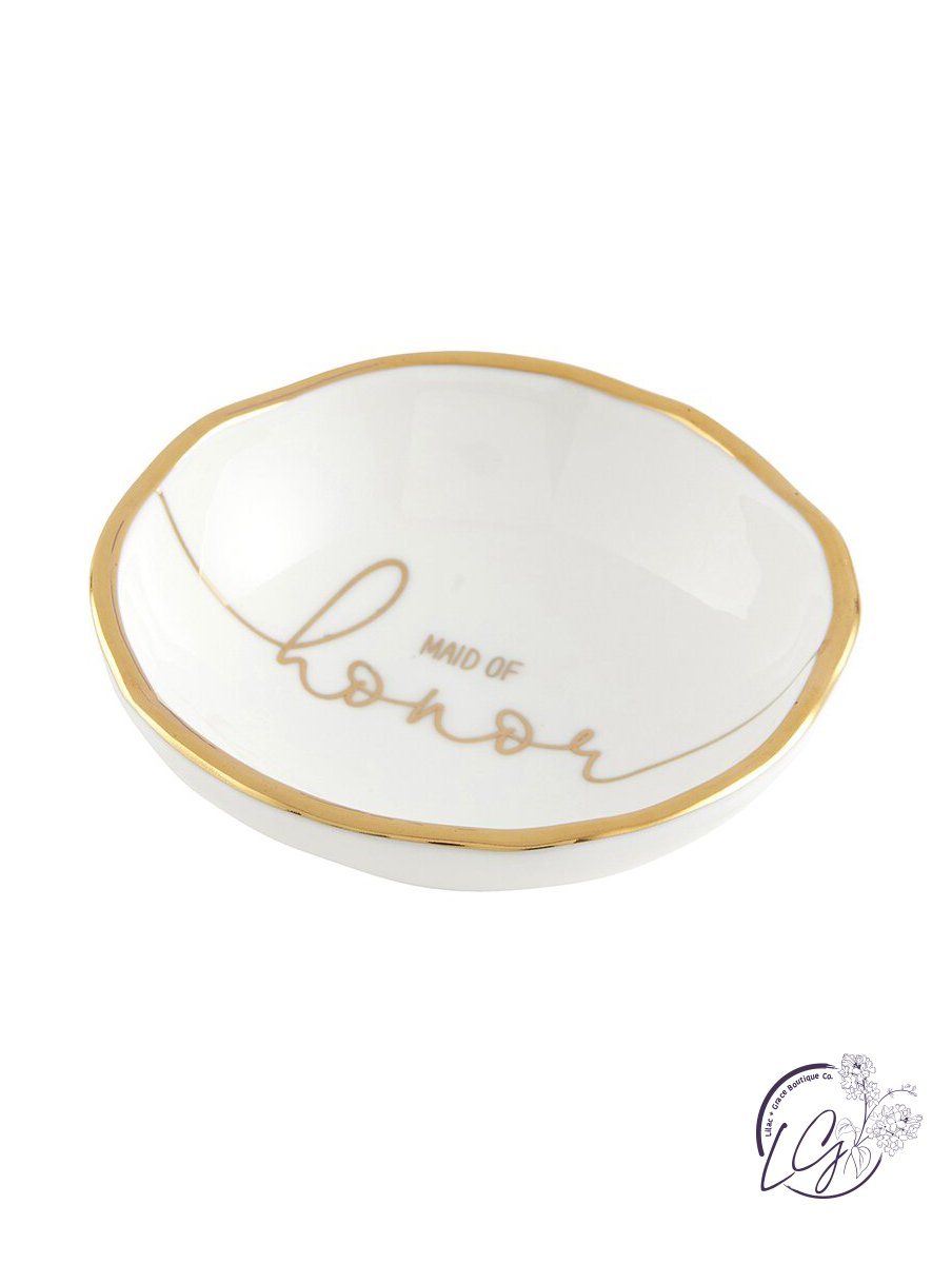 Elegance meets sentimentality in this beautifully crafted jewelry dish, adorned with the cherished title "Maid of Honor." A perfect fusion of style and heartfelt meaning, this exquisite dish is a tribute to the special woman who stands by your side on one of the most important days of your life. The dish boasts a timeless design, featuring refined details and a sophisticated aesthetic that complements any space.